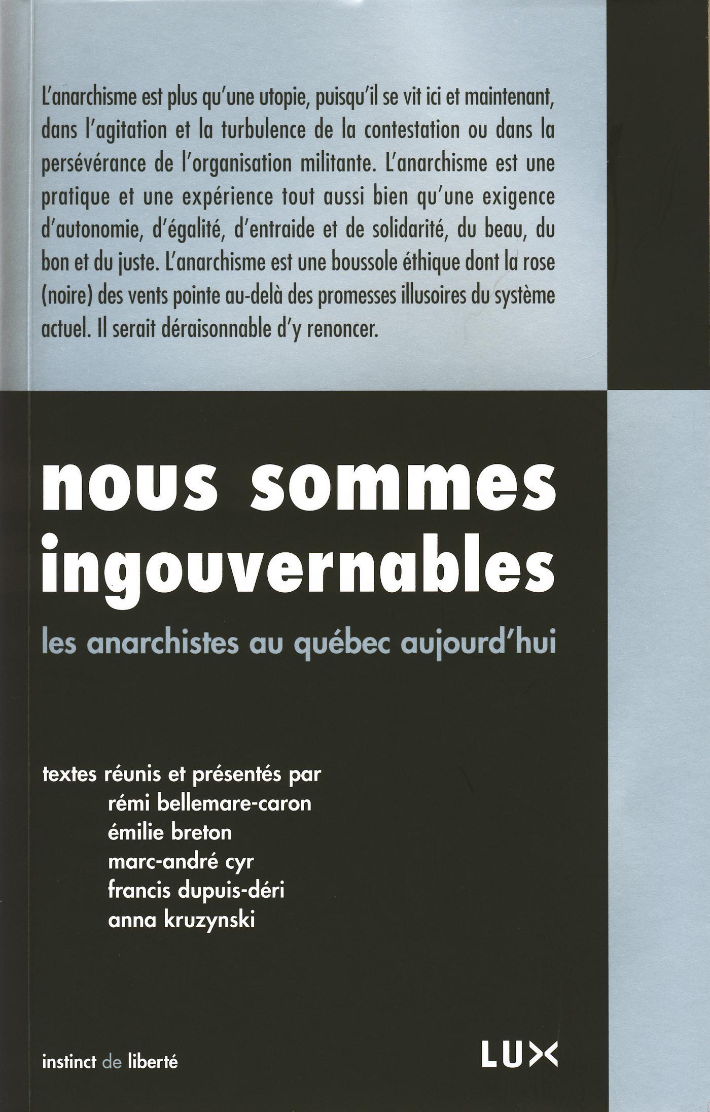 « Peut-être ne le savez-vous pas, mais les anarchistes sont très actifs au Québec », soutenait un chroniqueur du Journal de Montréal, au cours de la grande grève étudiante de 2012. Au-delà d’un phénomène spectaculaire associé au chaos, quelle est la véritable nature des activités de la nébuleuse anarchiste ? Et surtout, qui de mieux que des anarchistes pour l’expliquer ? Nous sommes ingouvernables constitue une réponse à plusieurs voix par des anarchistes qui militent dans divers réseaux. Cette mosaïque forme un portrait ouvert de ce qui fait le cœur et le corps du mouvement anarchiste aujourd’hui au Québec.