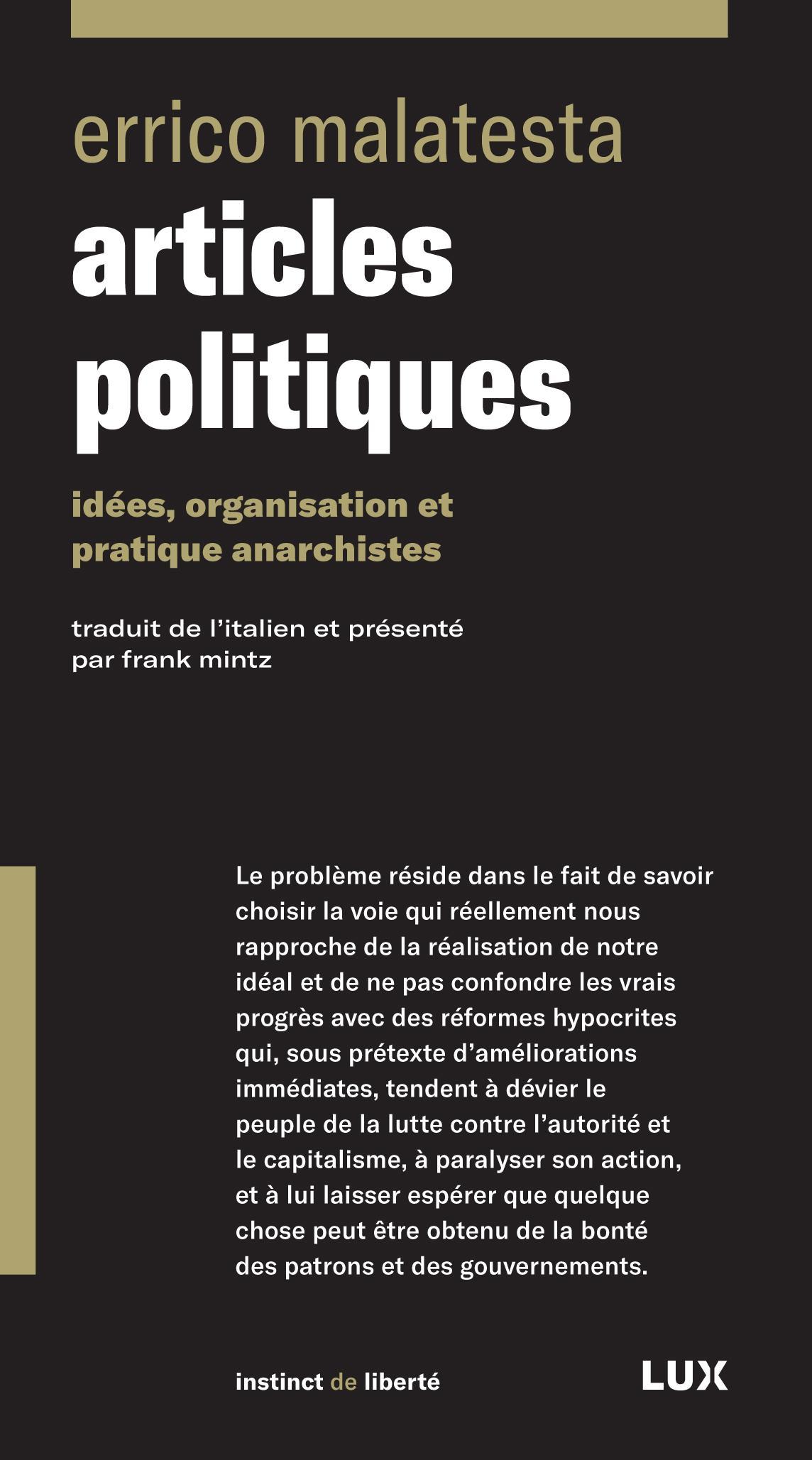 Figure emblématique et fondatrice de l’anarchisme, Errico Malatesta a contribué à de nombreux journaux, en créant lui-même plusieurs, au cours de sa longue vie à cheval sur les xixe et xxe siècles. Cette anthologie, parue initialement en 1976 chez 10/18, est ici rééditée, revue et augmentée par son traducteur et préfacier, Frank Mintz. On y retrouve des textes théoriques sur les principes de l’anarchisme, des interventions sur la pratique révolutionnaire (syndicalisme, propagande, abstentionnisme, lutte contre le fascisme, etc.), sur divers soulèvements populaires (semaine rouge d’Ancône, révolutions russe et espagnole, etc.) et sur certaines figures anarchistes et socialistes (Sacco et Vanzetti, Kropotkine, etc.).Les réflexions de Malatesta, loin d’être dépassées, continuent de présenter une grande actualité pour qui se réclame de la vaste et riche tradition de l’anarchisme.