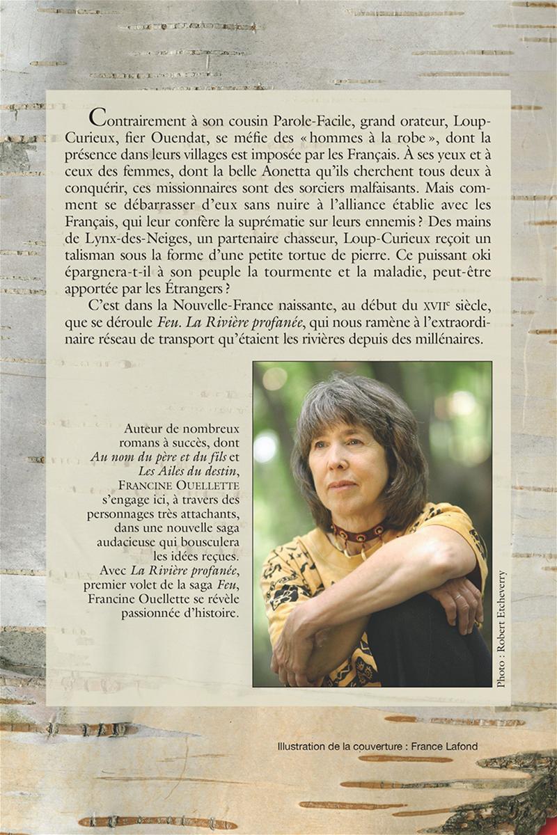 • Francine Ouellette est une romancière québécoise, née le 11 mars 1947 à Montréal. Son enfance est bercée par les récits de la Bavière de sa mère et ceux des Hautes-Laurentides de son père. Très jeune, elle se met à l'écriture et achève son premier roman à l'âge de douze ans. Elle poursuit ses études à l'École des beaux-arts de Montréal, puis devient enseignante en arts plastiques à la polyvalente Saint-Joseph, à Mont-Laurier, la ville natale de son père. Elle y enseigne pendant cinq ans, tout en continuant d'exercer sa plume en parallèle. Des élèves de la polyvalente lui lancent un jour un défi : sauter en parachute. C'est en relevant ce défi qu'elle se découvre une autre passion : voler.Ayant quitté l'enseignement, Francine Ouellette s'inscrit à l'école de pilotage de Mont-Laurier. Une idylle grandit entre elle et son instructeur dans le cockpit d'apprentissage. Ensemble, ils rêvent du Nord et d'aviation de brousse. En 1975, ils se retrouvent à Schefferville, où il accède aux commandes d'un Otter (DHC-3). Peu de temps après, elle devient son copilote. Naissent alors les romans Les Ailes du destin et Le Grand Blanc, qui ne seront publiés qu'une vingtaine d'années plus tard.De retour dans la région de Mont-Laurier, Francine Ouellette commence l'écriture d'un roman inspiré par les récits des gens qui ont colonisé les Hautes-Laurentides. Publié en 1984 et intitulé Au nom du père et du fils, ce roman se retrouve très vite en tête des best-sellers, tout comme Le Sorcier, la suite de cette fresque publiée l'année suivante. En 1993 et 1994, ces deux romans sont adaptés en téléséries de treize et onze épisodes d'une heure pour la chaîne de télévision TVA, et connaissent un succès phénoménal avec des cotes d'écoute de deux millions et demi de téléspectateurs.En 1989 paraît Sire Gaby du lac, un roman écologique dont la trame met en parallèle le combat d'un gamin et d'une association de riverains contre la pollution de leur lac, et la recherche du lac Tana par deux enfants éthiopiens frappés par la famine due à la sécheresse de 1984. Ce roman lui vaut le prix de Citoyenne de la nature en 1990.En 1992 et en 1993 paraissent Les Ailes du destin et sa suite, Le Grand Blanc, où tour à tour l'univers carcéral et l'ivresse du vol font vibrer le lecteur. Ces romans obtiennent un grand succès, de sorte que l'auteure se retrouve de nouveau en tête des ventes.En 1995, Francine Ouellette publie Bip, livre atypique dans la carrière de l'écrivaine. Bip est un personnage imaginaire qui fait partie de la vie de l'auteure depuis le jour où elle s'est trouvée pour la première fois devant une salle de classe, en 1968. Publié par les Éditions Libre Expression, ce livre est aujourd'hui épuisé. Il a été repris en 2001 par les Éditions Alexandre Stanké, où il devient la première des trois parties constituant l'intégral de l'aventure de Bip. Intitulé Bip, fantaisie philosophique, ce conte est illustré par l'auteure elle-même et, depuis 2011, a même traversé la frontière puisqu'il sert de référence pour enseigner le français à des élèves des États-Unis. Classé à tort dans la littérature jeunesse, Bip, fantaisie philosophique s'adresse à un public de tout âge et a même été étudié dans un cours de philosophie de niveau collégial.Parallèlement, la romancière a poursuivi durant une dizaine d'années des recherches approfondies afin d'élaborer le plan de sa saga Feu, dont les quatre premiers tomes, La rivière profanée, L'étranger, Fleur de lys et En 1837, j'avais dix-sept ans, paraissent respectivement en 2004, 2005, 2007 et 2012. Cette saga couvre une période de plus de trois cent soixante ans, soit du début du xviie siècle jusqu'en 1960. Conçue de manière que chaque tome puisse être lu indépendamment, cette saga constitue déjà une œuvre majeure de l'histoire et de la littérature du Québec. Véritable fresque, on y vit intensément au fil des pages l'histoire à travers des personnages fictifs, on ne peut plus fidèles à leur époque et à leur culture. À l'image d'Au nom du père et du fils et du Sorcier, des amours y éclosent, des hommes, femmes et enfants y rêvent, cherchent le bonheur, travaillent, combattent, cherchent un pays ou le défendent, tantôt soumis à la mainmise de l'Église en pays de colonisation, tantôt déchirés par le choc des cultures, que ce soit entre les Amérindiens et le monde des Blancs, ou entre les Canadiens français et les Canadiens anglais. Avec sa saga Feu, elle signe une œuvre majeure de la littérature québécoise, relatant l'histoire commune des peuples autochtones et blancs.Lauréate du prix Ludger-Duvernay, Francine Ouellette est reconnue comme l'une des plus importantes auteures de romans historiques au Québec. Elle a également remporté le Prix littéraire France-Québec ainsi que le Grand Prix du Salon du livre de Montréal.