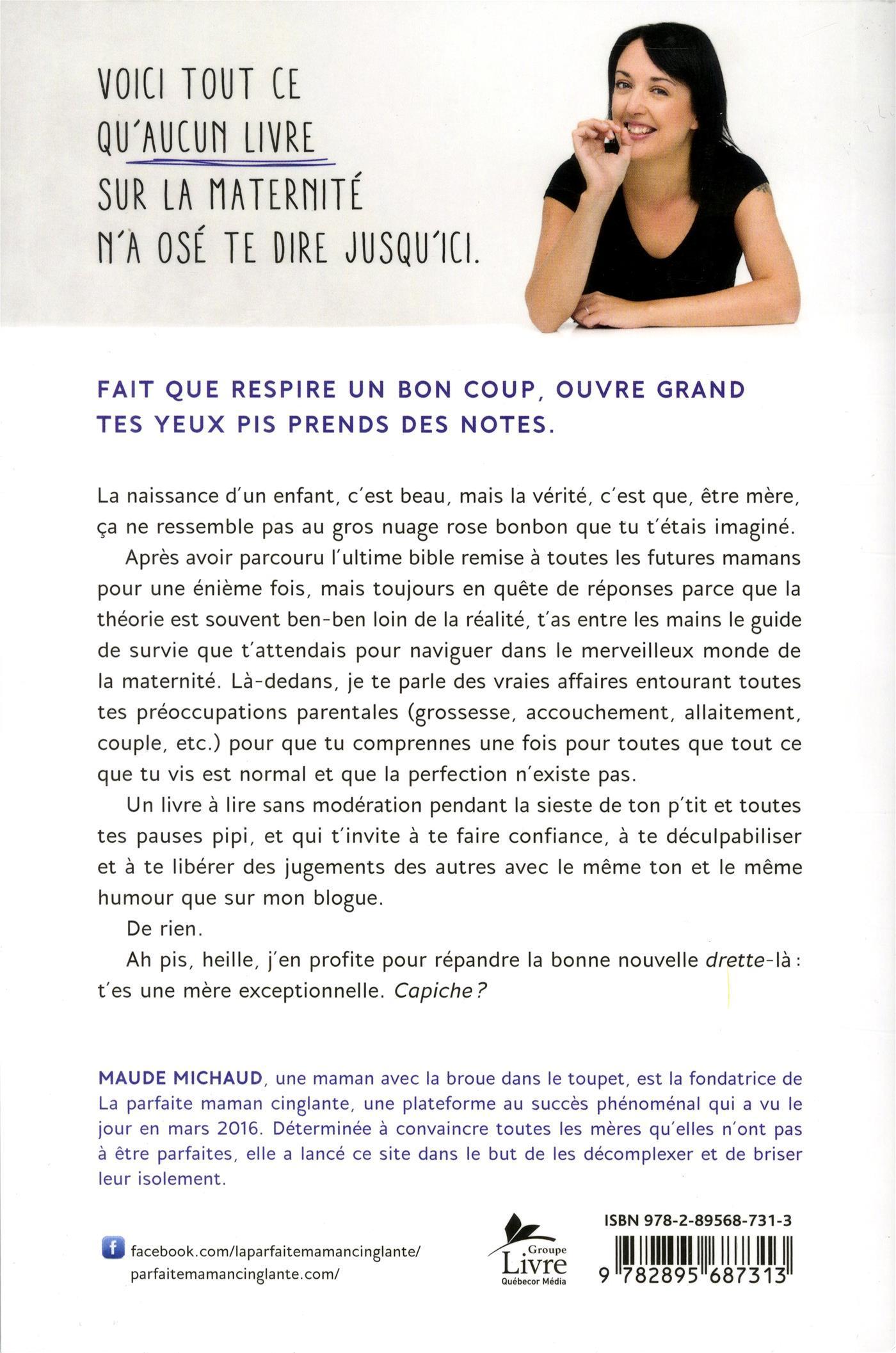 .La naissance d'un enfant, c'est beau, mais la vérité, c'est que, être mère, ça ne ressemble pas au gros nuage rose bonbon que tu t'étais imaginé. Après avoir parcouru l'ultime bible remise à toutes les futures mamans pour une énième fois, mais toujours en quête de réponses parce que la théorie est souvent ben-ben loin de la réalité, t'as entre les mains le guide de survie que t'attendais pour naviguer dans le merveilleux monde de la maternité. Là-dedans, je te parle des vraies affaires entourant toutes tes préoccupations parentales (grossesse, accouchement, allaitement, couple, etc.) pour que tu comprennes une fois pour toutes que tout ce que tu vis est normal et que la perfection n'existe pas.
