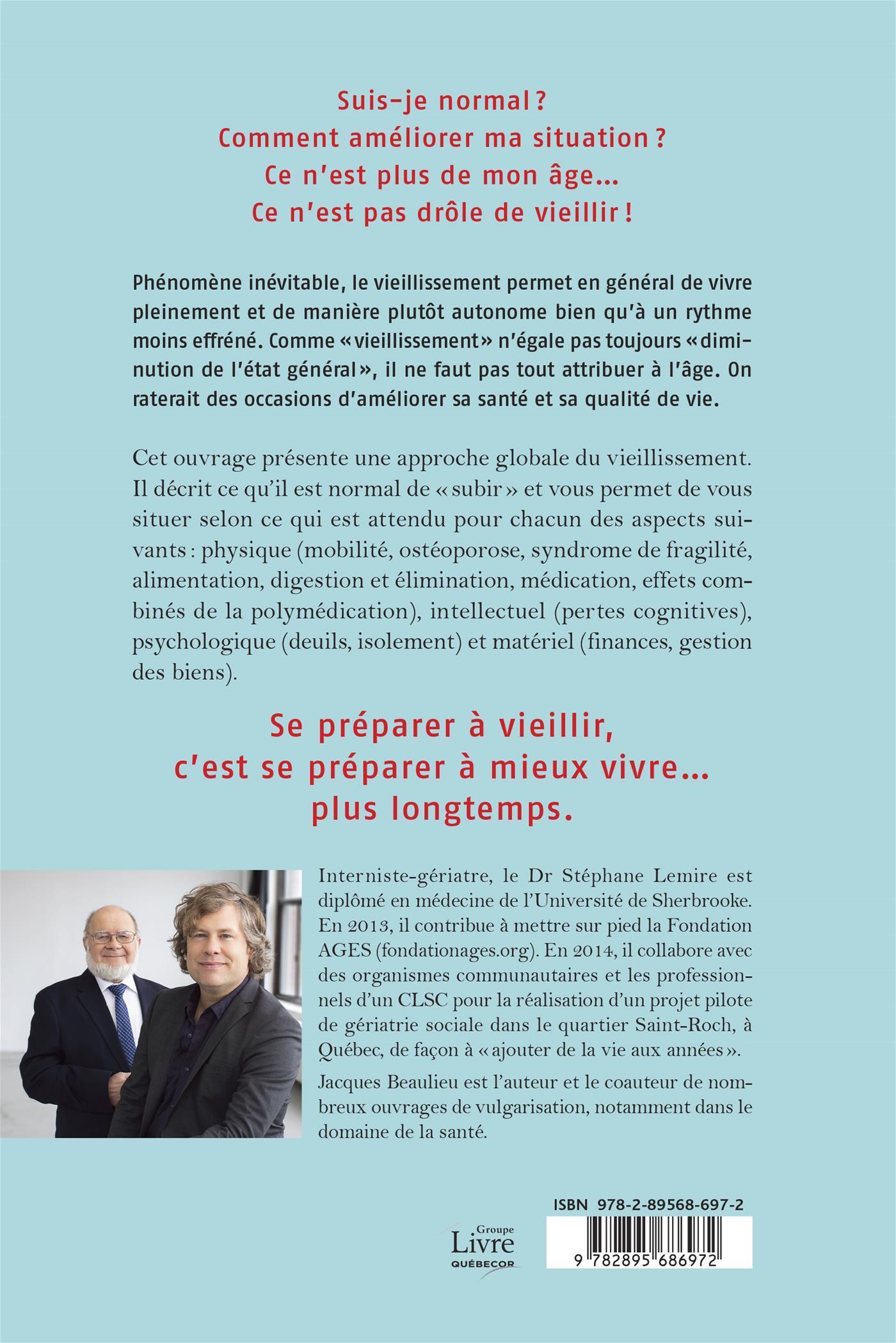 Phénomène inévitable, le vieillissement permet en général de vivre pleinement et de manière plutôt autonome bien qu'à un rythme moins effréné. Comme «vieillissement» n'égale pas toujours «diminution de l'état général », il ne faut pas tout attribuer à l'âge. On raterait des occasions d'améliorer sa santé et sa qualité de vie. Cet ouvrage présente une approche globale du vieillissement. Il décrit ce qu'il est normal de « subir » et vous permet de vous situer selon ce qui est attendu pour chacun des aspects suivants : physique (mobilité, ostéoporose, syndrome de fragilité, alimentation, digestion et élimination, médication, effets combinés de la polymédication), intellectuel (pertes cognitives), psychologique (deuils, isolement) et matériel (finances, gestion des biens).