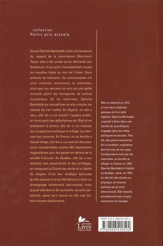 Quand Djemila Benhabib a pris connaissance du rapport de la commission Bouchard-Taylor, elle a été outrée qu'on demande aux Québécois d'accueillir favorablement toutes les requêtes faites au nom de l'islam. Sous prétexte de tolérance, les commissaires ont ainsi confondu musulmans et islamistes, alors que ces derniers ne sont qu'une petite minorité parmi les immigrants de culture musulmane. Or, les islamistes, Djemila Benhabib les connaît bien et elle a toutes les raisons de s'en méfier. En Algérie, où elle a vécu, elle les a vus envahir l'espace public, en tirant parti des défaillances de l'État et en pratiquant la terreur, elle les a vus imposer leur programme politique et infliger aux femmes leur tyrannie. En France, où sa famille a trouvé refuge, elle les a vus exercer des pressions insoutenables auprès des populations maghrébines pour les garder en dehors de la société d'accueil. Au Québec, elle les a vus réclamer des passe-droits et des privilèges, en invoquant la Charte des droits et la liberté de religion. C'est leur stratégie éprouvée qu'elle expose ici et qu'elle dénonce, dans un témoignage solidement documenté, mais auquel elle donne de touchants accents personnels, parce qu'il remue en elle une histoire encore douloureuse.