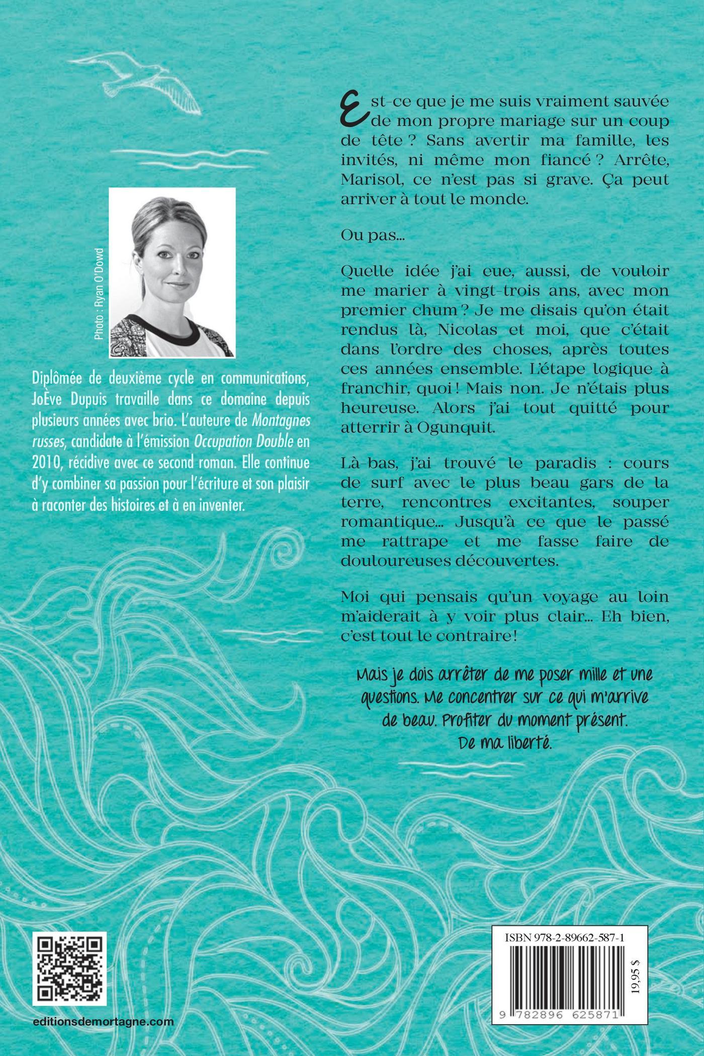 Est-ce que je me suis vraiment sauvée de mon propre mariage sur un coup de tête? Sans avertir ma famille, les invités, ni même mon fiancé? Arrête Marisol, ce n'est pas si grave. Ça peut arriver à tout le monde.Ou pas…Quelle idée j'ai eue aussi, de vouloir me marier à vingt-trois ans, avec mon premier chum? Je me disais qu'on était rendus là, Nicolas et moi, que c'était dans l'ordre des choses, après toutes ces années ensemble. L'étape logique à franchir, quoi? Mais non. Je n'étais plus heureuse. Alors j'ai tout quitté pour atterrir à Ogunquit.Là –bas, j'ai trouvé le paradis : cours de surf avec le plus beau gars de la terre, rencontres excitantes, souper romantique. Jusqu'à ce que le passé me rattrape et me fasse faire de douloureuses découvertes.Moi qui pensais qu'un voyage au loin m'aiderait à y voir plus clair. Eh bien, c'est tout le contraire!Mais je dois arrêter de me poser mille et une questions, me concentrer sur ce qui m'arrive de beau. Profiter du moment présent. De ma liberté.
