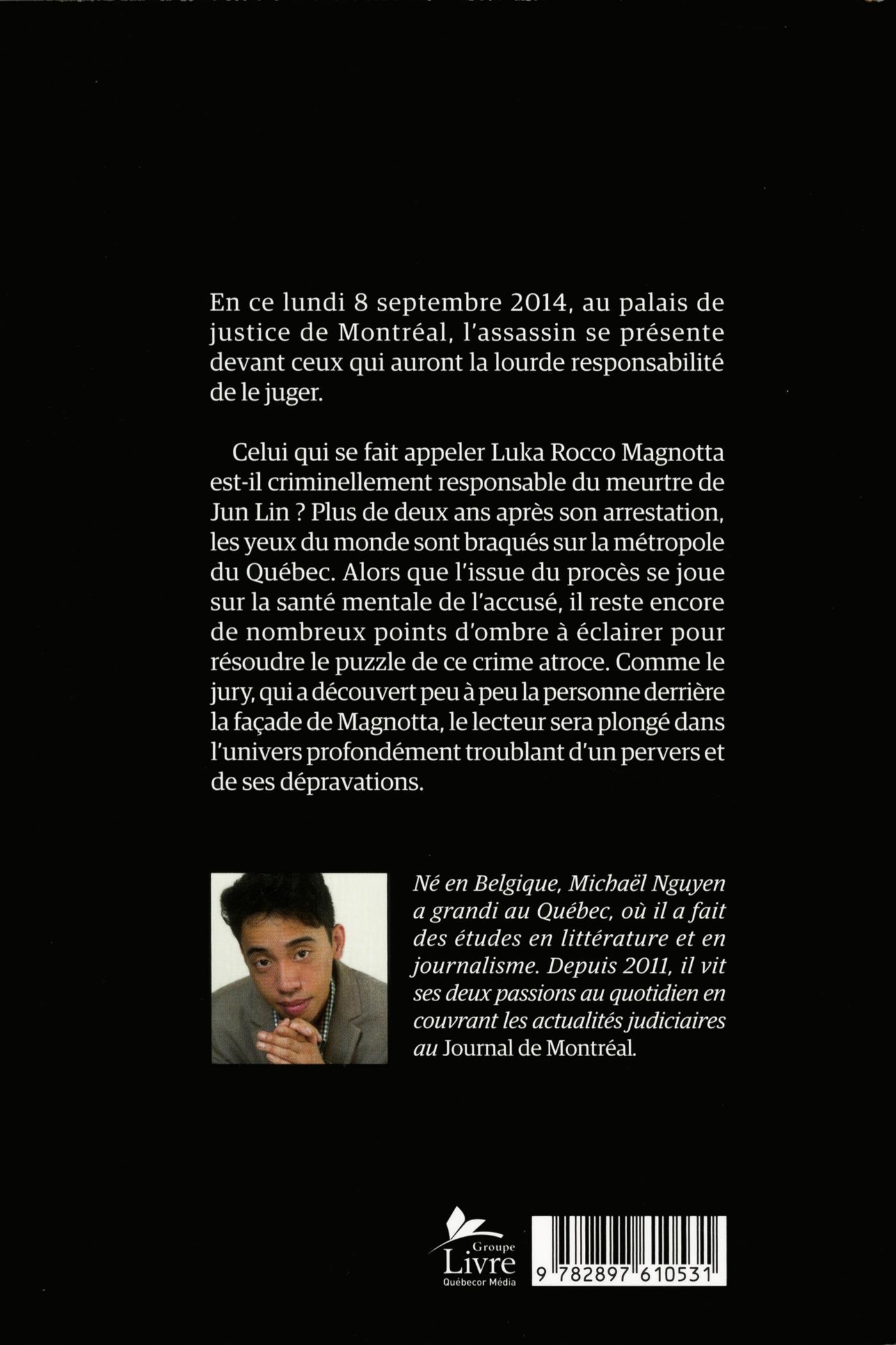 .Celui qui se fait appeler Luka Rocco Magnotta est-il criminellement responsable du meurtre de Jun Lin ? Plus de deux ans après son arrestation, les yeux du monde sont braqués sur la métropole du Québec. Alors que l'issue du procès se joue sur la santé mentale de l'accusé, il reste encore de nombreux points d'ombre à éclairer pour résoudre le puzzle de ce crime atroce. Comme le jury, qui a découvert peu à peu la personne derrière la façade de Magnotta, le lecteur sera plongé dans l'univers profondément troublant d'un pervers et de ses dépravations.