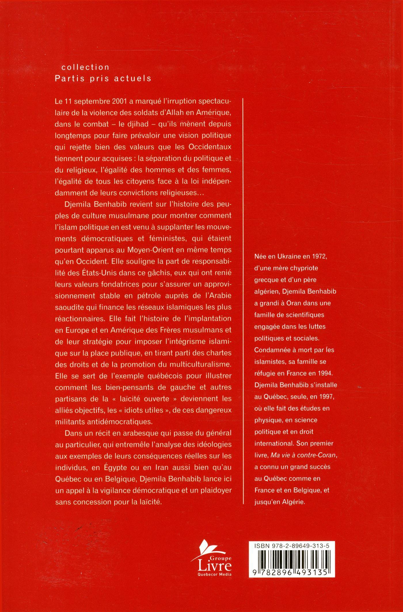 Djemila Benhabib revient sur l'histoire des peuples de culture musulmane pour montrer comment l'islam politique en est venu à supplanter les mouvements démocratiques et féministes, qui étaient pourtant apparus au Moyen-Orient en même temps qu'en Occident. Elle souligne la part de responsabilité des États-Unis dans ce gâchis, eux qui ont renié leurs valeurs fondatrices pour s'assurer en approvisionnement stable en pétrole auprès de l'Arabie saoudite qui finance les réseaux islamiques les plus réactionnaires. Elle fait l'histoire de l'implantation en Europe et en Amérique des Frères musulmans et de leur stratégie pour imposer l'intégrisme islamique sur la place publique, en tirant parti des chartes des droits et de la promotion du multiculturalisme. Elle se sert de l'exemple québécois pour illustrer comment les bien-pensants de gauche et autres partisans de la "laïcité ouverte" deviennent les alliés objectifs, les "idiots utiles", de ces dangereux militants antidémocratiques.