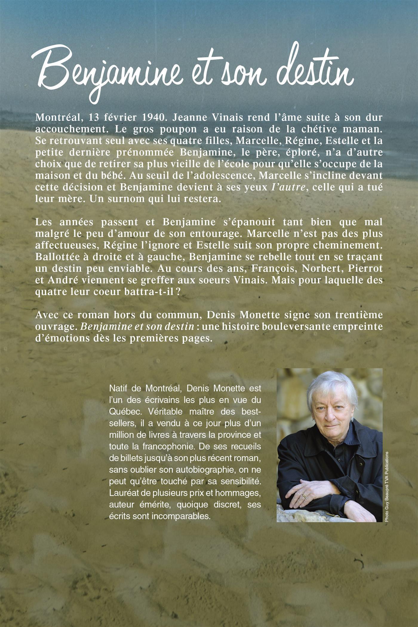 Avec ce roman hors du commun, Denis Monette signe son trentième ouvrage. Benjamine et son destin : une histoire bouleversante empreinte d'émotions dès les premières pages.