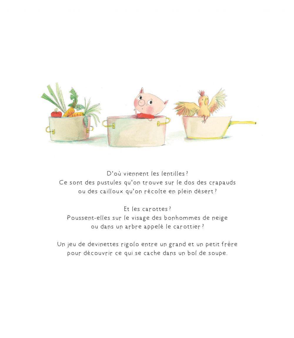 Le petit ne veut pas manger sa soupe parce qu’elle est trop chaude. En attendant qu’elle refroidisse, il assomme son grand frère de questions. D’où viennent les lentilles ? Et les carottes ? C’est quoi, ces trucs rouges qui flottent ?Le grand lui offre des choix de réponses pleines d’humour. Les lentilles ? Ça pousse dans des gousses ou sur le dos d’un crapaud ? Les carottes proviennent du nez des bonhommes de neige ou d’une plante potagère ?Une hilarante façon de découvrir ce qui se cache dans un bol de soupe.