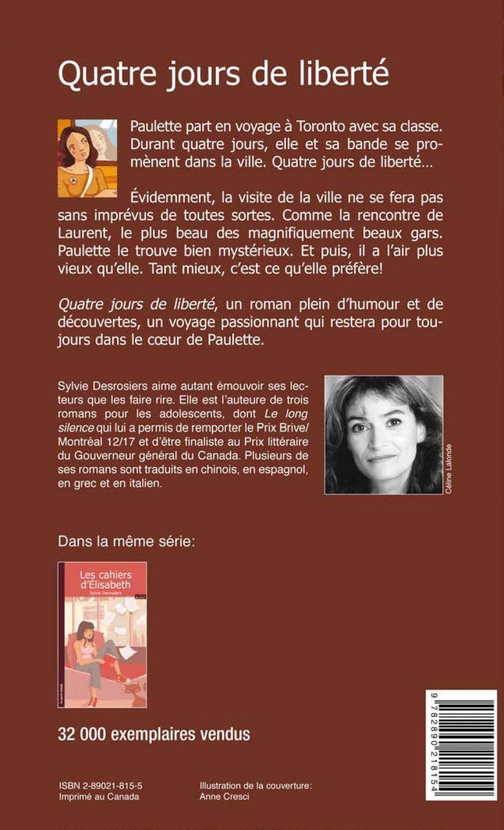 Paulette part en voyage à Toronto avec sa classe. Durant quatre jours, elle et sa bande se promènent dans la ville. Évidemment, la visite de la ville ne se fera pas sans imprévus de toutes sortes. Comme la rencontre de Laurent, le plus beau des magnifiquement beaux gars. Paulette le trouve bien mystérieux. Et puis, il a l’air plus vieux qu’elle. Tant mieux, c’est ce qu’elle préfère!Quatre jours de liberté, un roman plein d’humour et de découvertes, un voyage passionnant qui restera pour toujours dans le cœur de Paulette.