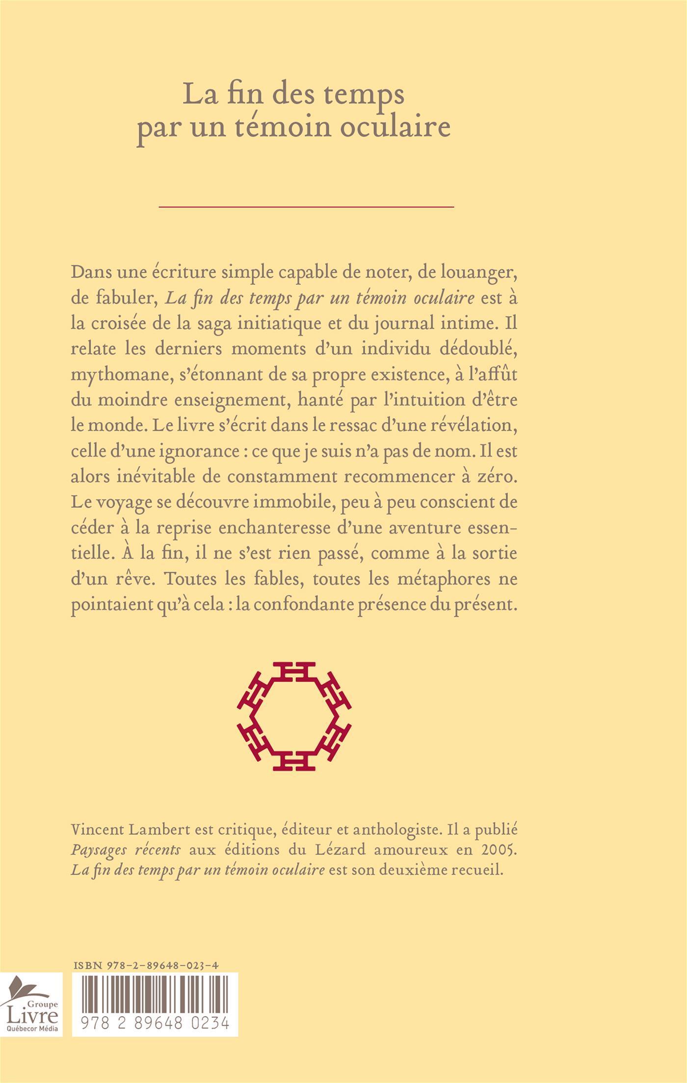 Dans une écriture simple capable de noter, de louanger, de fabuler, La fin des temps par un témoin oculaire est à la croisée de la saga initiatique et du journal intime. Il relate les derniers moments d'un individu dédoublé, mythomane, s'étonnant de sa propre existence, à l'affût du moindre enseignement, hanté par l'intuition d'être le monde. Le livre s'écrit dans le ressac d'une révélation, celle d'une ignorance : ce que je suis n'a pas de nom. Il est alors inévitable de constamment recommencer à zéro. Le voyage se découvre immobile, peu à peu conscient de céder à la reprise enchanteresse d'une aventure essentielle. À la fin, il ne s'est rien passé, comme à la sortie d'un rêve. Toutes les fables, toutes les métaphores ne pointaient qu'à cela : la confondante présence du présent.