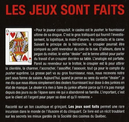 «Pour le joueur compulsif, le casino est le pusher, le fournisseur ultime de sa drogue. C'est le gros trafiquant qui fournit l'investissement, la logistique, la main-d'œuvre, les contacts et la came. Suivant le principe de la hiérarchie, le croupier pourrait être comparé au petit revendeur du coin de la rue. D'ailleurs, dans le jargon du métier, le verbe dealer est le terme utilisé pour parler du travail du croupier derrière sa table. L'analogie est parfaite. […] Raconté sur un ton caustique et grinçant, un récit troublant sur les secrets les mieux gardés de la Société des casinos du Québec.