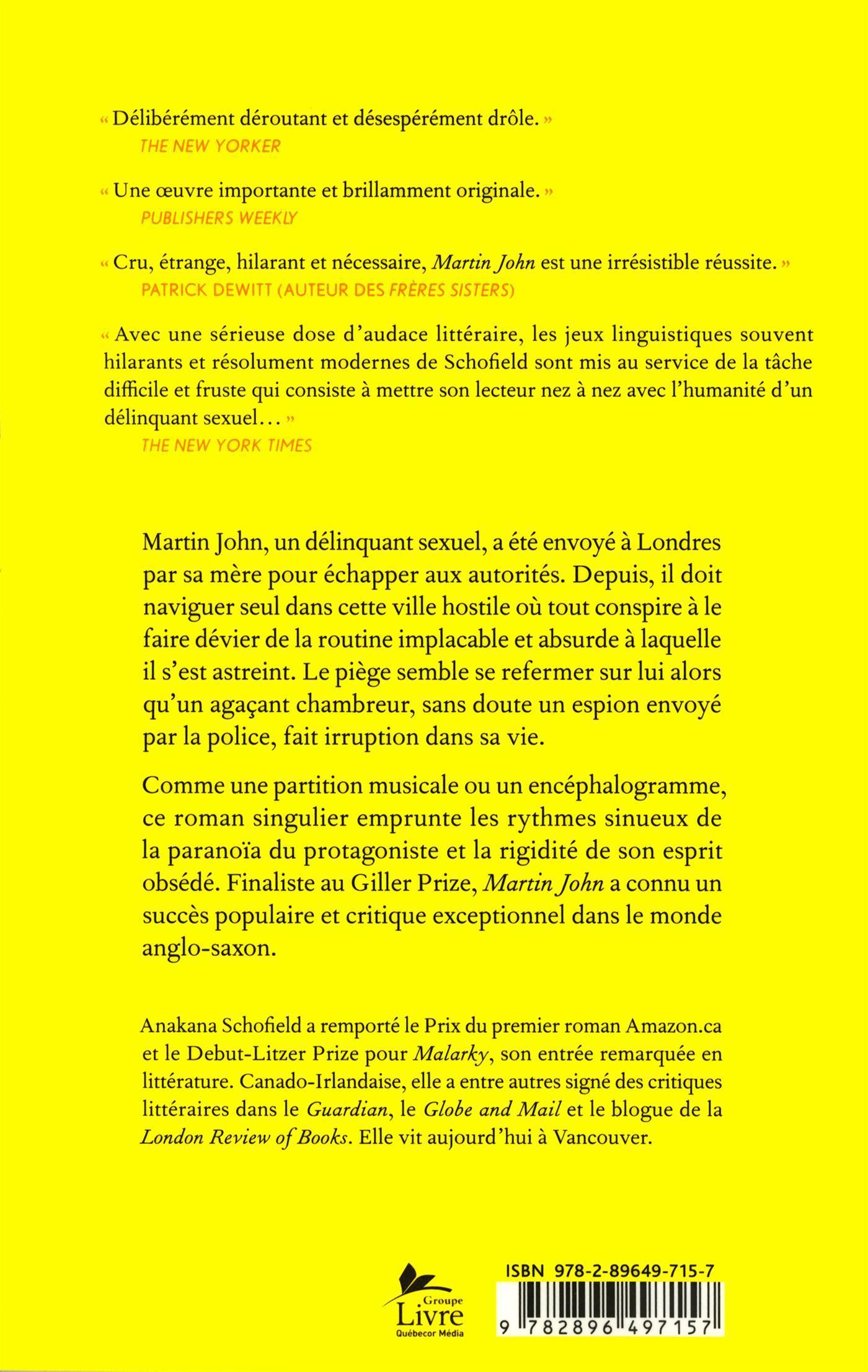 Comme une partition musicale ou un encéphalogramme, ce roman singulier emprunte les rythmes sinueux de la paranoïa du protagoniste et la rigidité de son esprit obsédé. Finaliste au Giller Prize, Martin John a connu un succès populaire et critique exceptionnel dans le monde anglo-saxon.