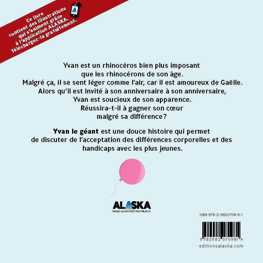 Yvan est un rhinocéros bien plus imposant que les rhinocérons de son âge. Malgré ça, il se sent léger comme l’air, car il est amoureux de Gaëlle. Alors qu’elle l’invite à son anniversaire, Yvan est soucieux de son apparence. Réussira-t-il à gagner son cœur malgré sa différence ?Yvan le géant est une douce histoire qui permet de discuter de l’acceptation des différences corporelles et des handicaps avec les plus jeunes.Ce livre est une oeuvre interactive. Il contient des illustrations qui s'animent grâce à la réalité augmentée. Téléchargez gratuitement l'application ALASKA.