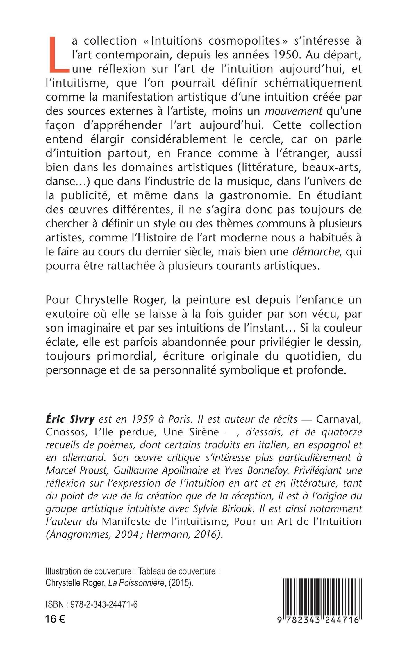 La collection « Intuitions cosmopolites » s’intéresse àl’art contemporain, depuis les années 1950. Au départ, une réflexion sur l’art de l’intuition aujourd’hui, et l’intuitisme, que l’on pourrait définir schématiquement comme la manifestation artistique d’une intuition créée par des sources externes à l’artiste, moins un mouvement qu’une façon d’appréhender l’art aujourd’hui. En étudiant des oeuvres différentes, il ne s’agira donc pas toujours de chercher à définir un style ou des thèmes communs à plusieurs artistes, comme l’Histoire de l’art moderne nous a habitués à le faire au cours du dernier siècle, mais bien une démarche, qui pourra être rattachée à plusieurs courants artistiques. Pour Chrystelle Roger, la peinture est depuis l’enfance un exutoire où elle se laisse à la fois guider par son vécu, par son imaginaire et par ses intuitions de l’instant... Si la couleur éclate, elle est parfois abandonnée pour privilégier le dessin, toujours primordial, écriture originale du quotidien, du personnage et de sa personnalité symbolique et profonde.