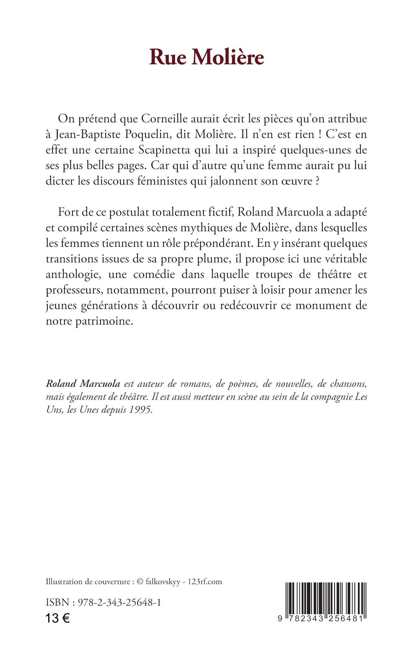On prétend que Corneille aurait écrit les pièces qu’on attribue à Jean-Baptiste Poquelin, dit Molière. Il n’en est rien ! C’est en effet une certaine Scapinetta qui lui a inspiré quelques-unes de ses plus belles pages. Car qui d’autre qu’une femme aurait pu lui dicter les discours féministes qui jalonnent son œuvre ? Fort de ce postulat totalement fictif, Roland Marcuola a adapté et compilé certaines scènes mythiques de Molière, dans lesquelles les femmes tiennent un rôle prépondérant. En y insérant quelques transitions issues de sa propre plume, il propose ici une véritable anthologie, une comédie dans laquelle troupes de théâtre et professeurs, notamment, pourront puiser à loisir pour amener les jeunes générations à découvrir ou redécouvrir ce monument de notre patrimoine.