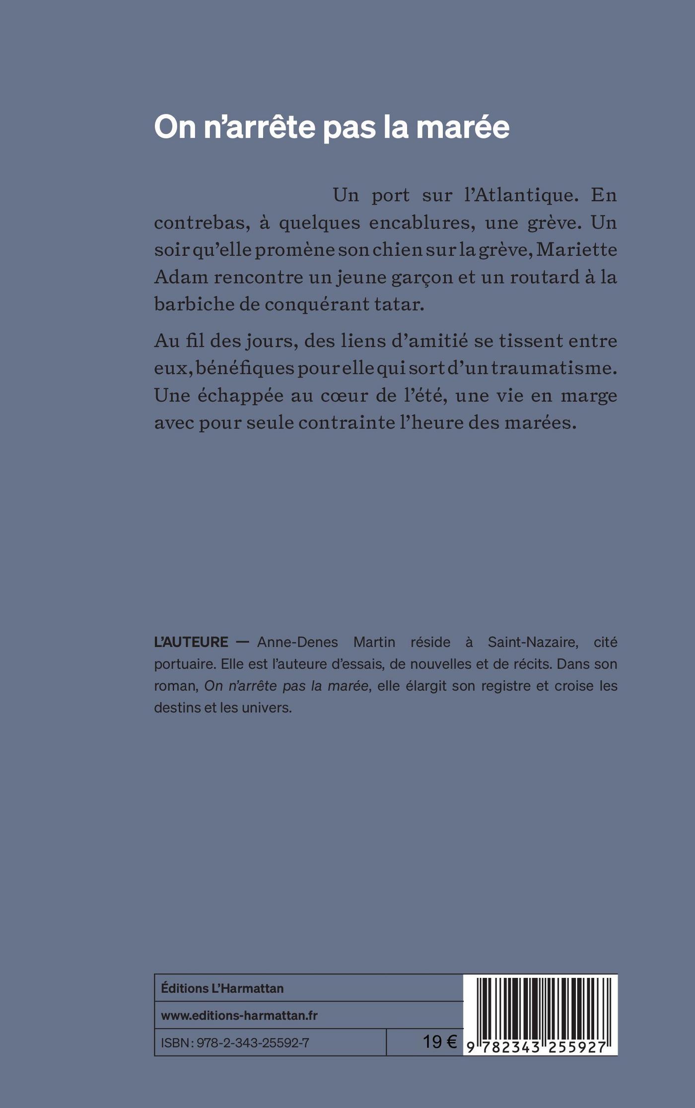 Un port sur l’Atlantique. En contrebas, à quelques encablures, une grève. Un soir qu’elle promène son chien sur la grève, Mariette Adam rencontre un jeune garçon et un routard à la barbiche de conquérant tatar. Au fil des jours, des liens d’amitié se tissent entre eux, bénéfiques pour elle qui sort d’un traumatisme. Une échappée au coeur de l’été, une vie en marge avec pour seule contrainte l’heure des marées.