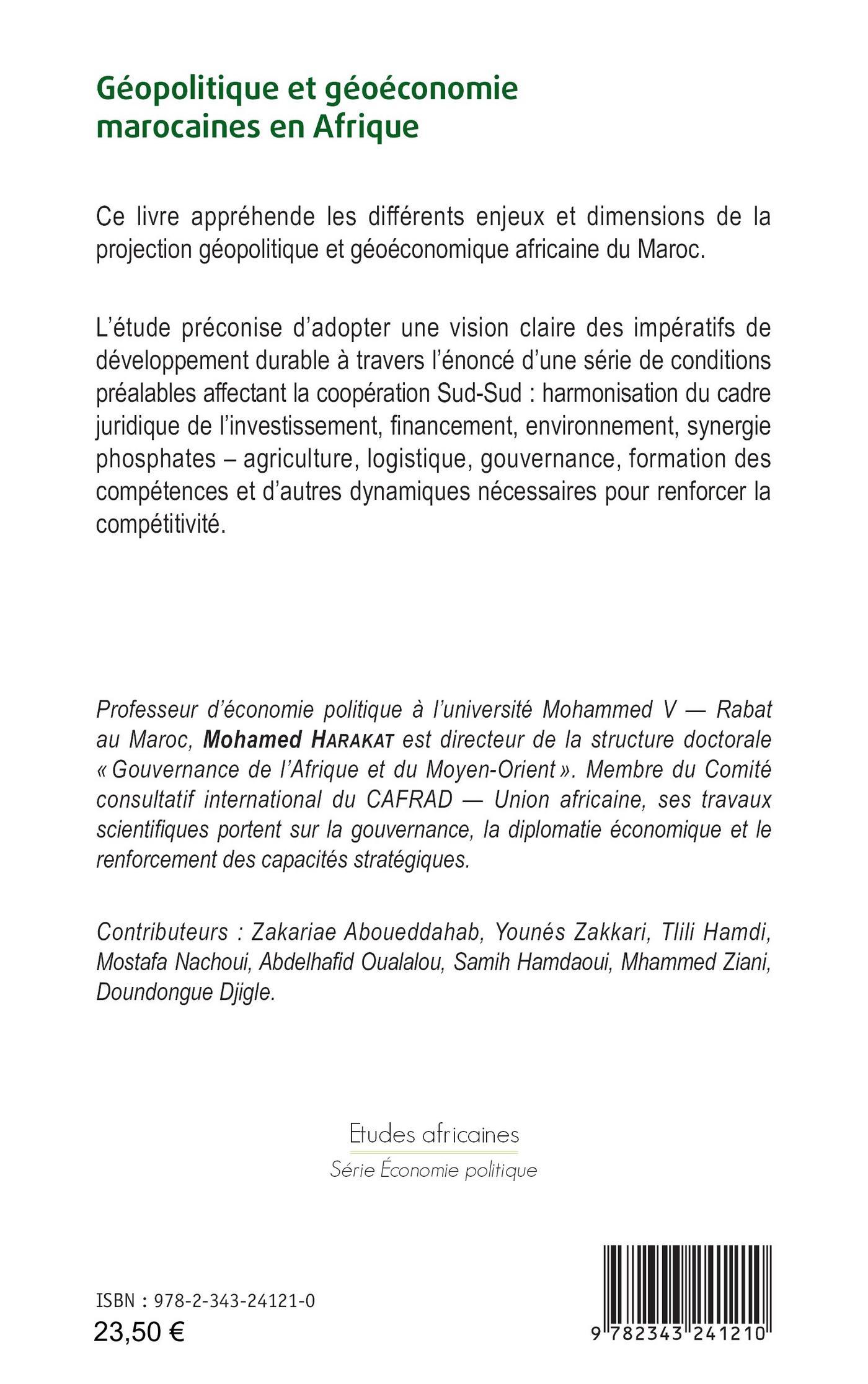 Ce livre appréhende les différents enjeux et dimensions de la projection géopolitique et géoéconomique africaine du Maroc. L’étude préconise d’adopter une vision claire des impératifs de développement durable à travers l’énoncé d’une série de conditions préalables affectant la coopération Sud-Sud : harmonisation du cadre juridique de l’investissement, financement, environnement, synergie phosphates, agriculture, logistique, gouvernance, formation des compétences et d’autres dynamiques nécessaires pour renforcer la compétitivité.