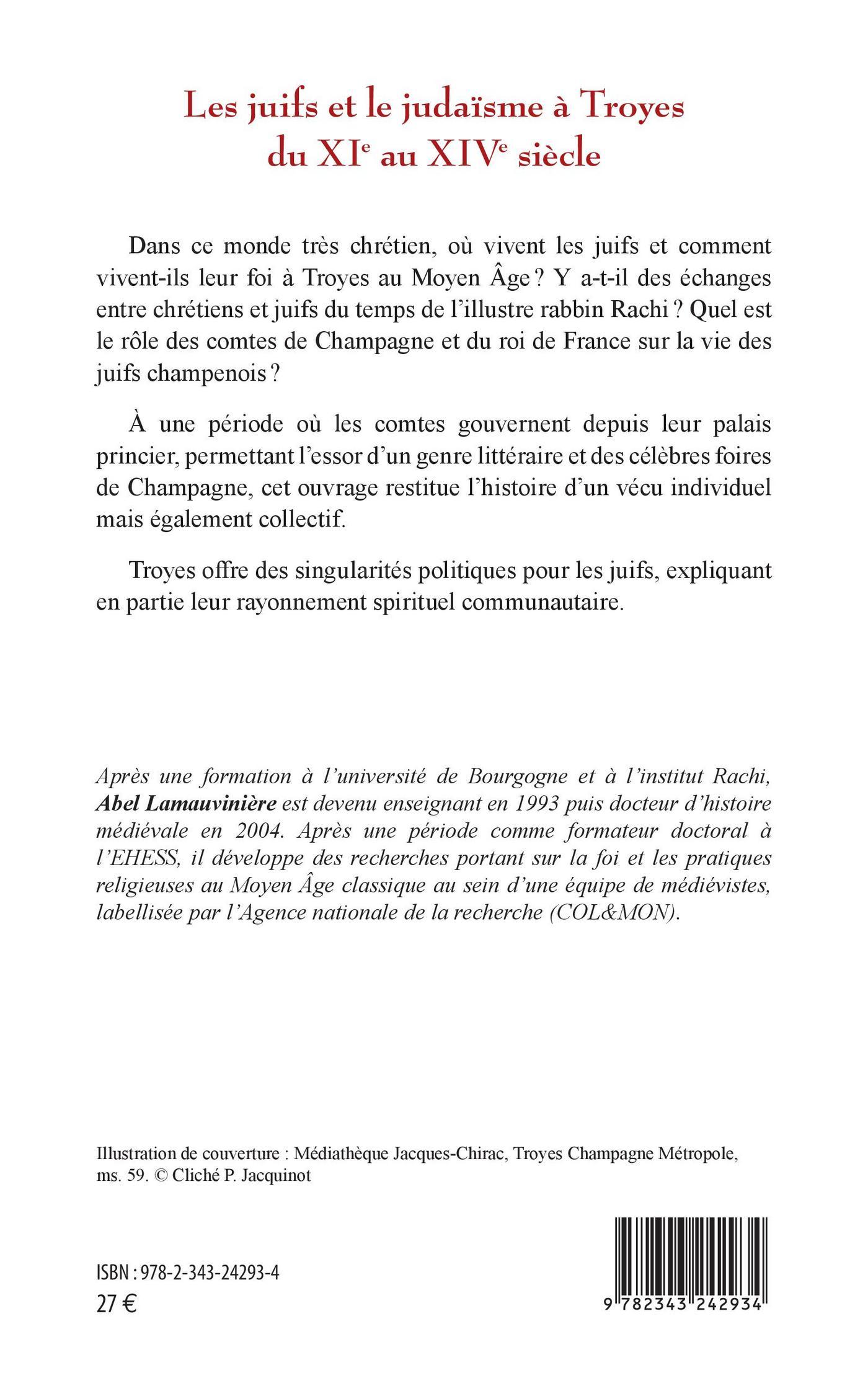 Dans ce monde très chrétien, où vivent les juifs et comment vivent-ils leur foi à Troyes au Moyen Âge ? Y a-t-il des échanges entre chrétiens et juifs du temps de l'illustre rabbin Rachi ? Quel est le rôle des comtes de Champagne et du roi de France sur la vie des juifs champenois ? À une période où les comtes gouvernent depuis leur palais princier, permettant l'essor d'un genre littéraire et des célèbres foires de Champagne, cet ouvrage restitue l'histoire d'un vécu individuel mais également collectif. Troyes offre des singularités politiques pour les juifs, expliquant en partie leur rayonnement spirituel communautaire.