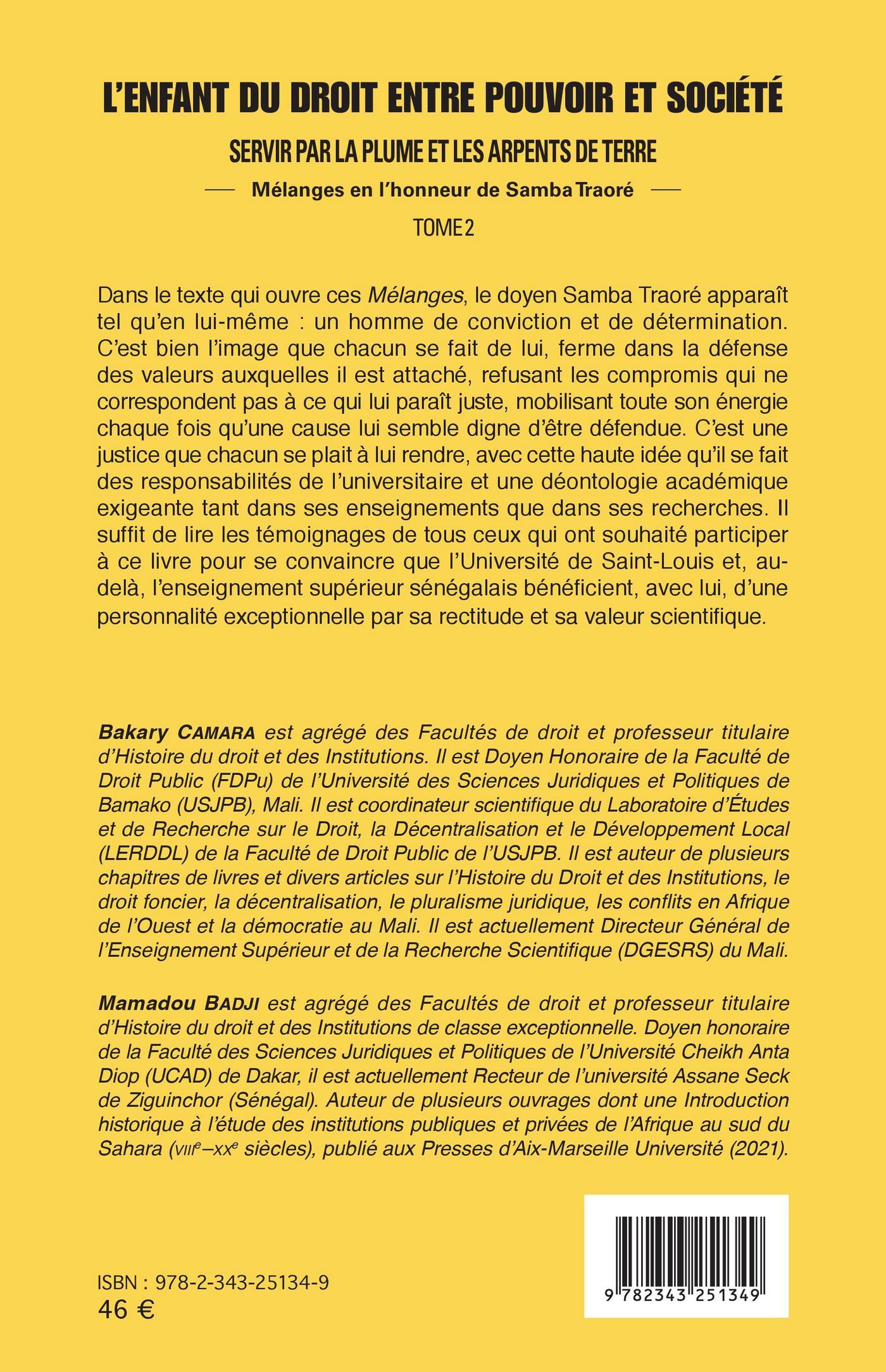 Bakary Camara est agrégé des Facultés de droit et professeur titulaire d'Histoire du droit et des Institutions. Il est Doyen Honoraire de la Faculté de Droit Public (FDPu) de l'Université des Sciences Juridiques et Politiques de Bamako (USJPB). Il est actuellement Directeur Général de l'Enseignement Supérieur et de la Recherche Scientifique (DGESRS) du Mali.Mamadou Badji est agrégé des Facultés de droit et professeur titulaire d'Histoire du droit et des Institutions de classe exceptionnelle. Doyen honoraire de la Faculté des Sciences Juridiques et Politiques de l'Université Cheikh Anta Diop (UCAD) de Dakar, il est actuellement Recteur de l'université Assane Seck de Ziguinchor (Sénégal).