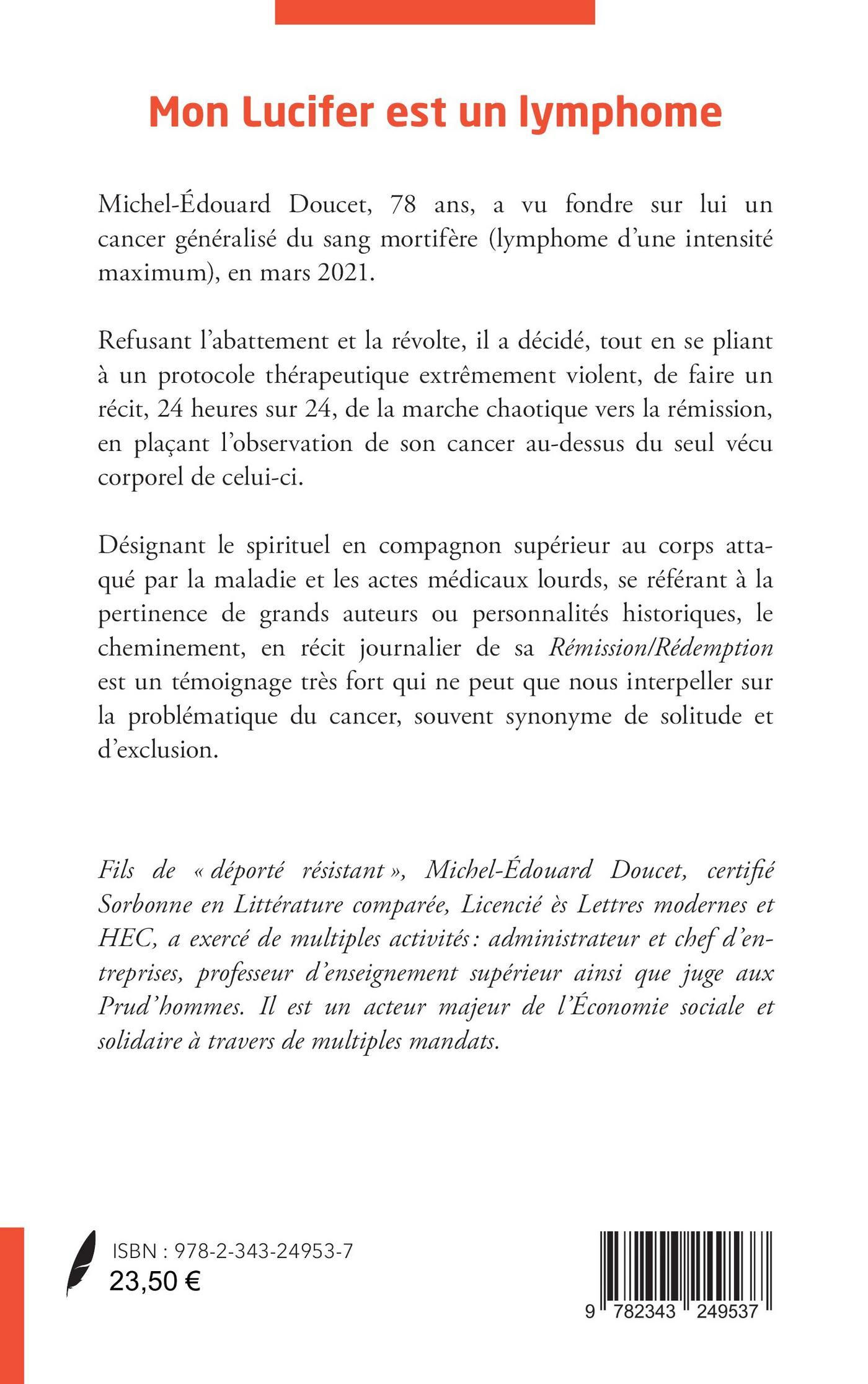 Michel-Édouard Doucet, 78 ans, a vu fondre sur lui un cancer généralisé du sang mortifère (lymphome d’une intensité maximum), en mars 2021.Refusant l’abattement et la révolte, il a décidé, tout en se pliant à un protocole thérapeutique extrêmement violent, de faire un récit, 24 heures sur 24, de la marche chaotique vers la rémission,en plaçant l’observation de son cancer au-dessus du seul vécu corporel de celui-ci. Désignant le spirituel en compagnon supérieur au corps attaqué par la maladie et les actes médicaux lourds, se référant à la pertinence de grands auteurs ou personnalités historiques, le cheminement en récit journalier de sa Rémission/Rédemption est un témoignage très fort qui ne peut que nous interpeller sur la problématique du cancer, souvent synonyme de solitude et d’exclusion.