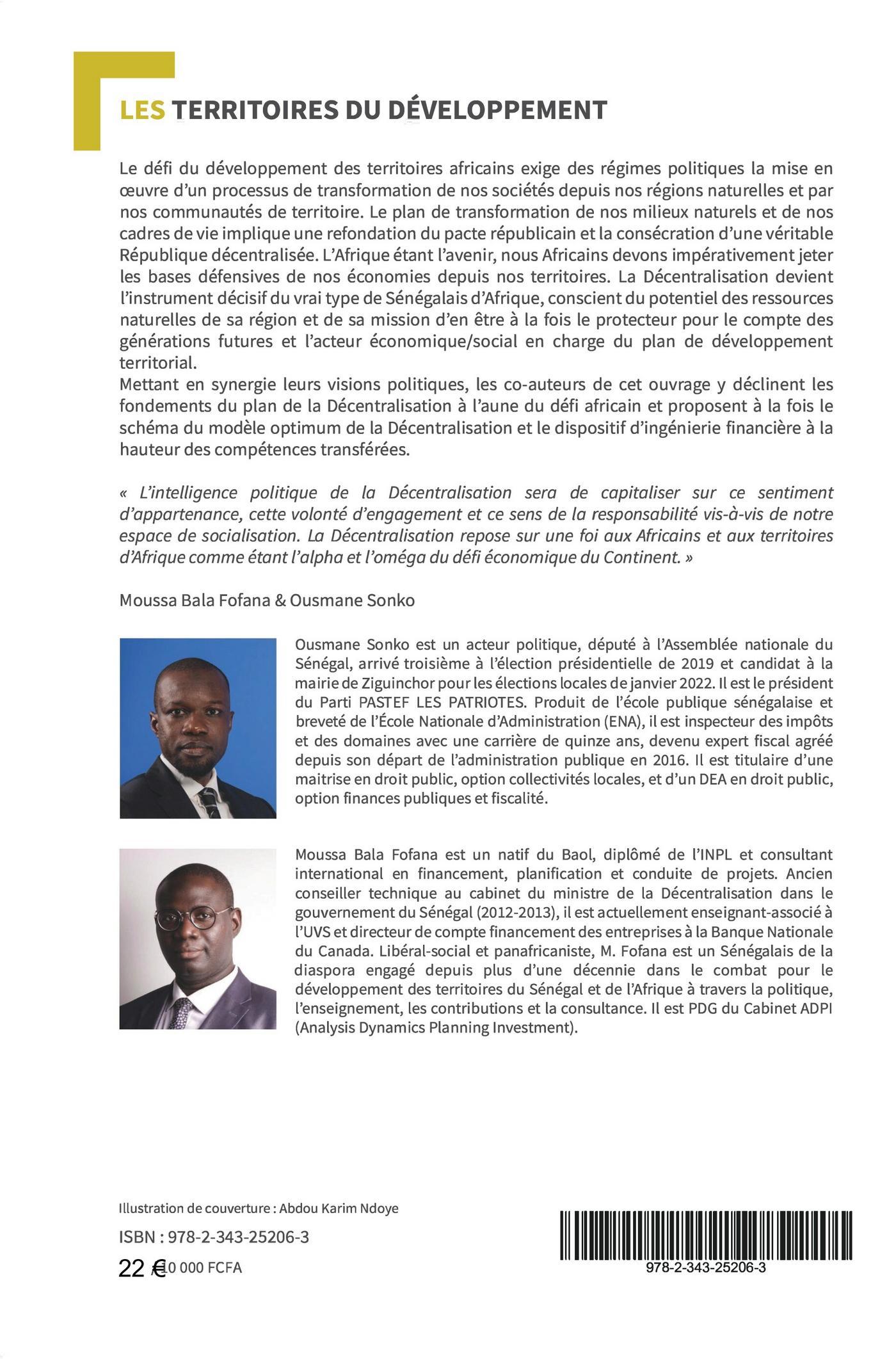 Le défi du développement des territoires africains exige des régimes politiques la mise en oeuvre d'un processus de transformation de nos sociétés depuis nos régions naturelles et par nos communautés de territoire. La Décentralisation devient l'instrument décisif du vrai type de Sénégalais d'Afrique, conscient du potentiel des ressources naturelles de sa région et de sa mission d'en être à la fois le protecteur pour le compte des générations futures et l'acteur économique/social en charge du plan de développement territorial. Mettant en synergie leurs visions politiques, les co-auteurs de cet ouvrage y déclinent les fondements du plan de la Décentralisation à l'aune du défi africain et proposent à la fois le schéma du modèle optimum de la Décentralisation et le dispositif d'ingénierie financière à la hauteur des compétences transférées.