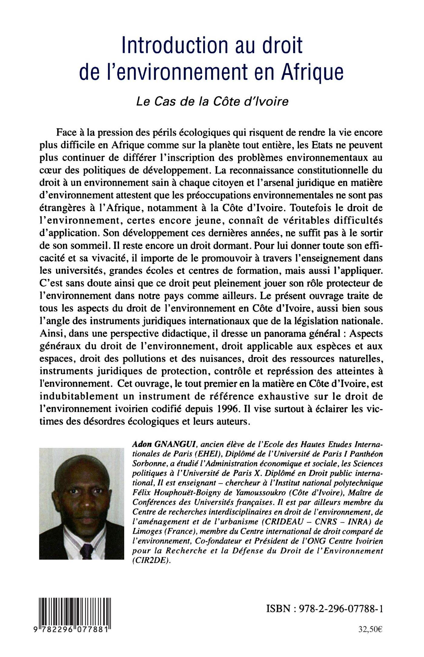 Cet ouvrage traite de tous les aspects du droit de l'environnement en Côte d'Ivoire, aussi bien sous l'angle des instruments juridiques internationaux que de la législation nationale. Il dresse un panorama général : aspects généraux du droit de l'environnement, droit applicable aux espèces et aux espaces, droit des pollutions et des nuisances, droit des ressources naturelles, instruments juridiques de protection, contrôle et répression des atteintes à l'environnement.
