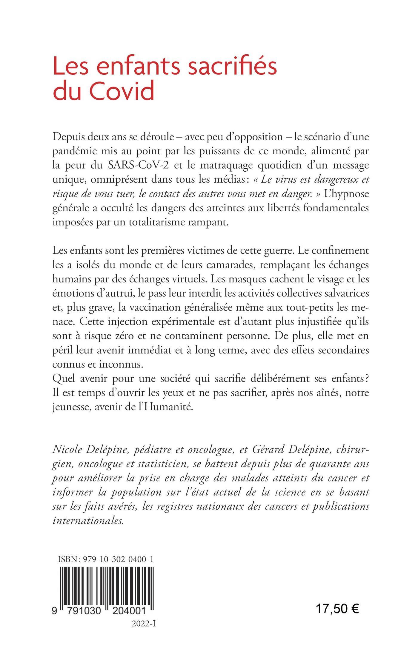 Depuis deux ans se déroule – avec peu d’opposition – le scénario d’une pandémie mis au point par les puissants de ce monde, alimenté par la peur du SARS-CoV-2 et le matraquage quotidien d’un message unique, omniprésent dans tous les médias : « Le virus est dangereux et risque de vous tuer, le contact des autres vous met en danger. » L’hypnose générale a occulté les dangers des atteintes aux libertés fondamentales imposées par un totalitarisme rampant.Les enfants sont les premières victimes de cette guerre. Le con nement les a isolés du monde et de leurs camarades, remplaçant les échanges humains par des échanges virtuels. Les masques cachent le visage et les émotions d’autrui, le pass leur interdit les activités collectives salvatrices et, plus grave, la vaccination généralisée même aux tout-petits les me- nace. Cette injection expérimentale est d’autant plus injustifiée qu’ils sont à risque zéro et ne contaminent personne. De plus, elle met en péril leur avenir immédiat et à long terme, avec des e ets secondaires connus et inconnus.Quel avenir pour une société qui sacri e délibérément ses enfants? Il est temps d’ouvrir les yeux et ne pas sacri er, après nos aînés, notre jeunesse, avenir de l’Humanité.