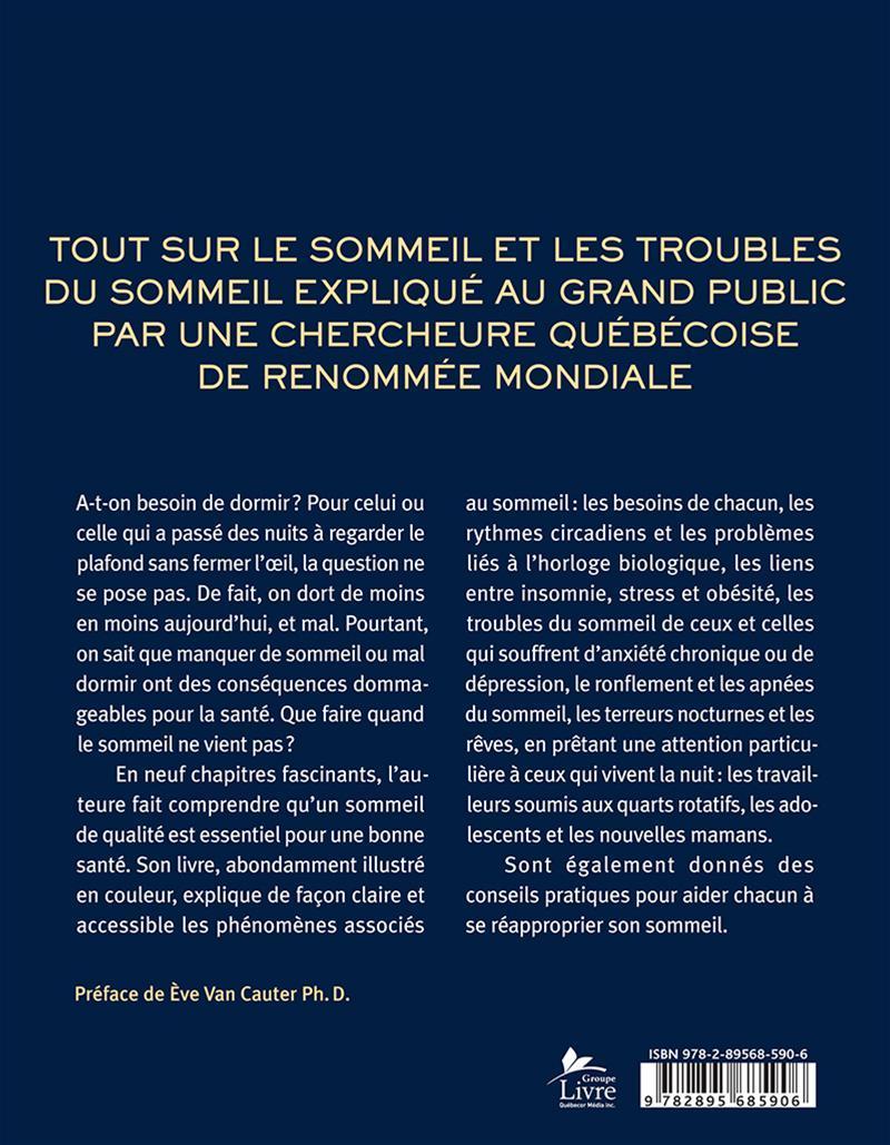 ..Abondamment illustré de figures, de tableaux et de photos, ce livre explique de façon claire et accessible les différents phénomènes associés au sommeil : pourquoi on dort, les besoins de sommeil de chacun, les liens entre insomnie, stress et obésité, les problèmes liés à l'horloge biologique, pourquoi ceux et celles qui souffrent d'anxiété chronique ou de dépression dorment mal, le ronflement et les apnées du sommeil, les terreurs nocturnes et les rêves, etc.
