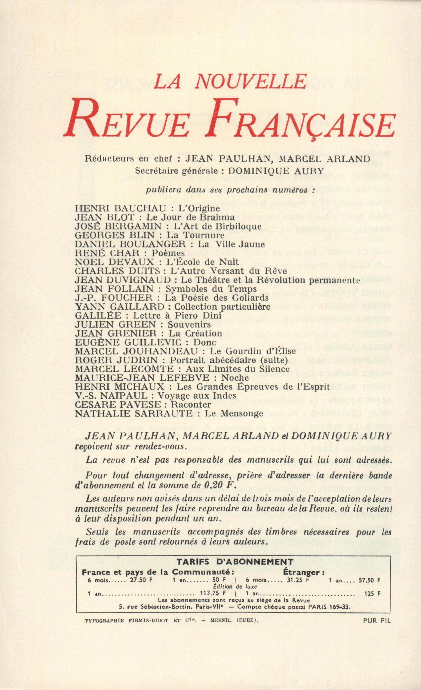 Jacques Audiberti, Dimanche m'attendJean Starobinski, Kierkegaard et les Masques (Fin)Jean Wahl, PočmesJohn Cowper Powys, Un Adorateur du VentMarguerite Yourcenar, La Mort ŕ MunsterChroniques : Roger Judrin, Villiers de L'Isle-Adam Étiemble, Počtes ou faiseurs? [Scaldes et Iraniens]Claude Roy, Le Théâtre de la Cruauté en EuropeJean-Louis Curtis, Psychanalyse d'une fille en orAndré Dalmas, Lecture de VitruveNotes : la poésie : Claude Michel Cluny, Le Chien ŕ la mandoline, par Raymond Queneau (Gallimard)Philippe Jaccottet, Pierre écrite, par Yves Bonnefoy (Mercure de France)Claude Michel Cluny, Les Villes ouvertes, par Jean Tortel (Gallimard)Jean Tortel, Les Plages de Thulé, par Jean Laude (Le Seuil)Notes : littérature et essais : Willy de Spens, Les Libertins au XVIIe sičcle (Buchet-Chastel)Franz Hellens, Contes immoraux, du prince de Ligne (Nouvel Office d'Édition)Robert Abirached, Guillaume Apollinaire, Alcools, par Marie-Jeanne Durry (Société d'édition d'enseignement supérieur)Willy de Spens, Journées de lectures, par Roger Nimier (Gallimard)Notes : lettres étrangčres : Claude Michel Cluny, La Lune et les Feux, par Cesare Pavese (Gallimard)Alain Clerval, Conclusion, par Henry Green (Gallimard)Claude Michel Cluny, Monsieur G. A. ŕ X, par Tibor Déry (Éditions du Seuil)Notes : les spectacles : Raymond Bellour, Le regard de MunkNotes : les arts : Gérard Mourgue, Poésie de dessins chez CocteauRenée Boullier, André Masson - ŤComparaisons 65ťLe temps comme il passe : Antonin Artaud, Ŕ Alfredo GangotenaJérôme Peignot, Un mousquetaire de la plumeMichel Deguy, L'OcéanideJean Lebrau, BrindillesTextes : Vitruve, Quatre chapitres du Livre Cinquičme