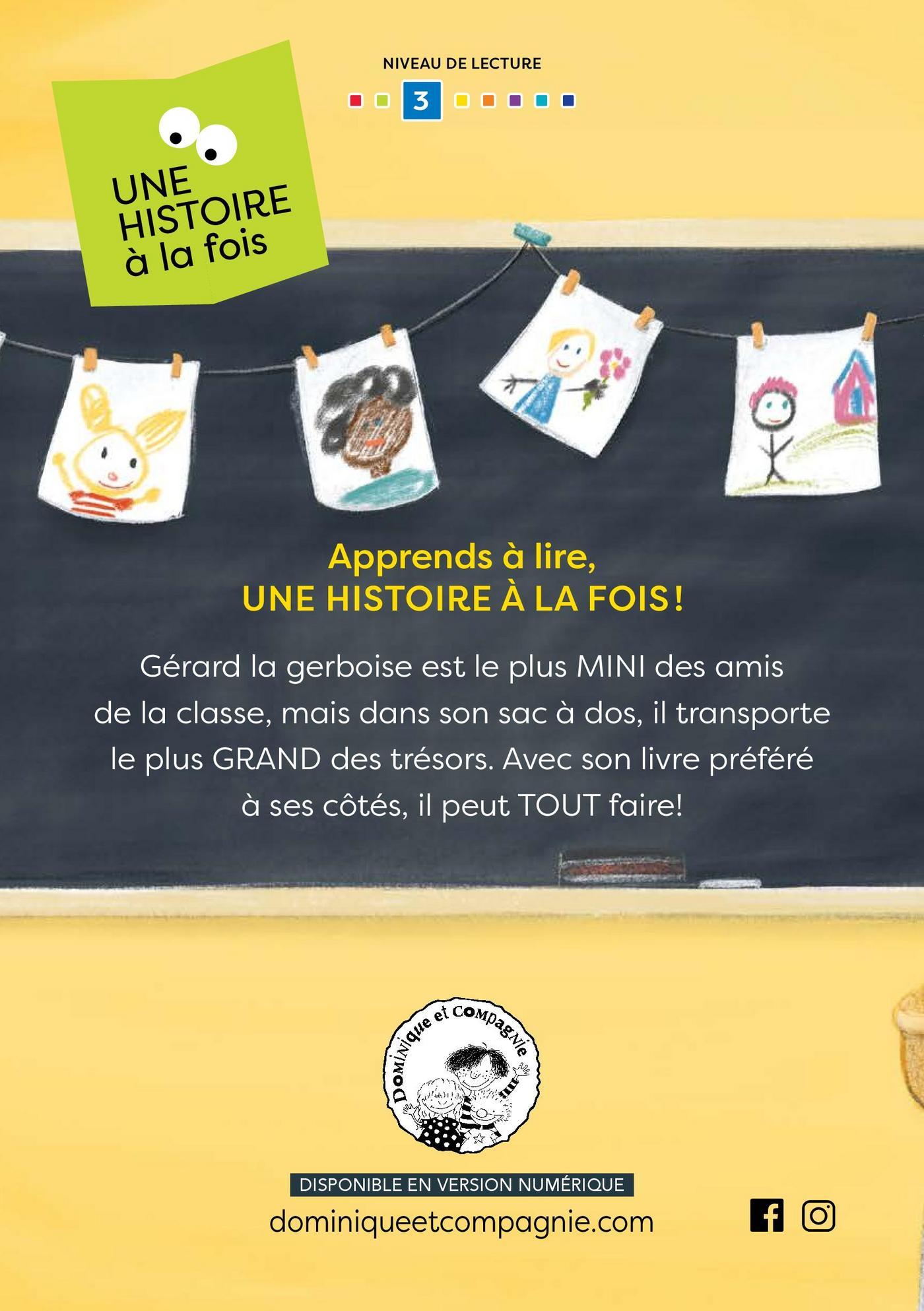 Aujourd’hui, c’est la rentrée scolaire. Gérard la gerboise est fier ! Il transporte son magnifique sac à dos tout neuf. Le problème, c’est qu’il est vide. Presque vide. Dans son sac d’école, Gérard a emmené une seule chose : un livre. Il n’a pas d’autre matériel scolaire. Tout un défi pour le plus petit élève de la classe! Heureusement, notre rongeur ne manque pas d’imagination. Avec son livre préféré à ses côtés, il sait qu’il peut relever tous les défis.