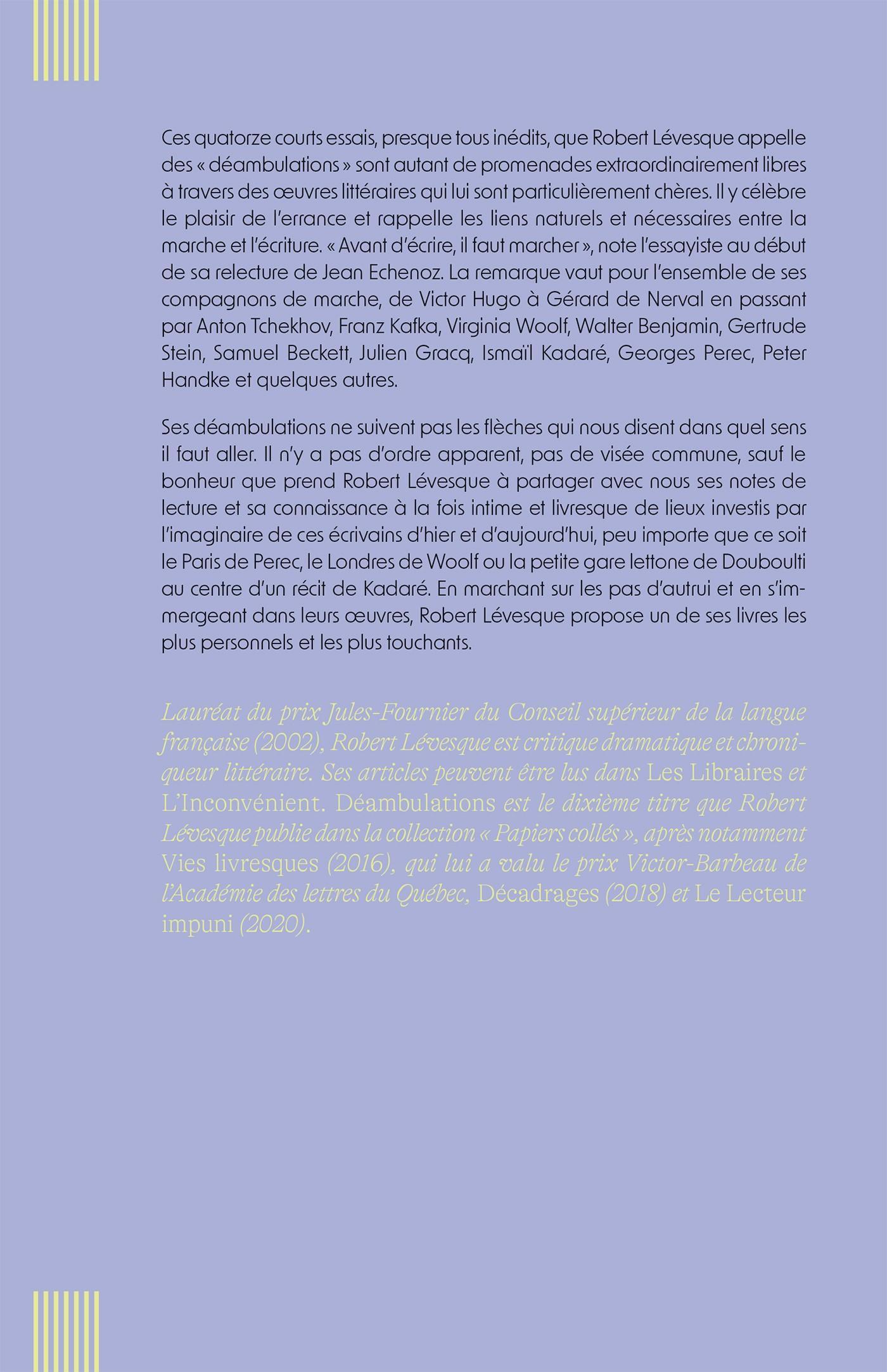 Ces quatorze courts essais, presque tous inédits, que Robert Lévesque appelle des « déambulations » sont autant de promenades extraordinairement libres à travers des œuvres littéraires qui lui sont particulièrement chères. Il y célèbre le plaisir de l’errance et rappelle les liens naturels et comme nécessaires entre la marche et l’écriture. « Avant d’écrire, il faut marcher », note l’essayiste au début de sa relecture de Jean Echenoz. La remarque vaut pour l’ensemble de ses compagnons de marche, de Victor Hugo à Gérard de Nerval en passant par Anton Tchekhov, Franz Kafka, Virginia Woolf, Walter Benjamin, Gertrude Stein, Samuel Beckett, Julien Gracq, Ismaïl Kadaré, Georges Perec, Peter Handke et quelques autres.Ses déambulations ne suivent pas les flèches qui nous disent dans quel sens il faut aller. Il n’y a pas d’ordre apparent, pas de visée commune, sauf le bonheur que prend Robert Lévesque à partager avec nous ses notes de lecture et sa connaissance à la fois intime et livresque de lieux investis par l’imaginaire de ces écrivains d’hier et d’aujourd’hui, peu importe que ce soit le Paris de Perec, la Londres de Woolf ou la petite gare lettonne de Douboulti au centre d’un récit de Kadaré. En marchant sur les pas d’autrui et en s’immergeant dans leurs œuvres, Robert Lévesque propose un de ses livres les plus personnels et les plus touchants.