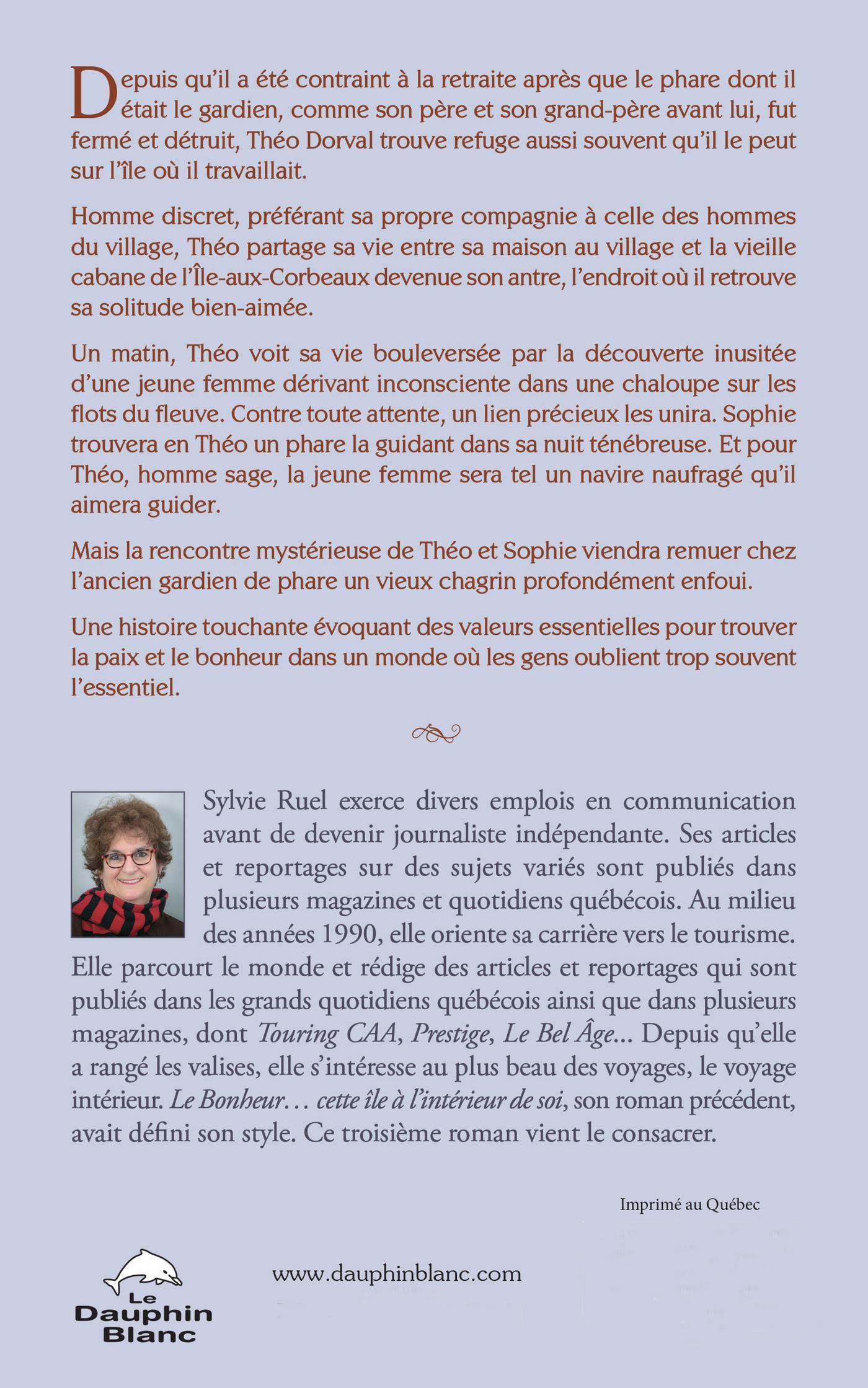 Depuis qu’il a été contraint à la retraite après que le phare dont il était le gardien, comme son père et son grand-père avant lui, fut fermé et détruit, Théo Dorval trouve refuge aussi souvent qu’il le peut sur l’île où il travaillait.Homme discret, préférant sa propre compagnie à celle des hommes du village, Théo partageait sa vie entre sa maison au village et la vieille cabane de l’Île-aux-Corbeaux devenue son antre, l’endroit où il retrouve sa solitude bien-aimée.Un matin, Théo voit sa vie bouleversée par la découverte inusitée d’une jeune femme dérivant inconsciente dans une chaloupe sur les flots du fleuve. Contre toute attente, un lien précieux les unira. Sophie trouvera en Théo un phare la guidant dans sa nuit ténébreuse. Et pour Théo, homme sage, la jeune femme sera tel un navire naufragé qu’il aimera guider.Mais la rencontre mystérieuse de Théo et Sophie viendra remuer chez l’ancien gardien de phare un vieux chagrin profondément enfoui.Une histoire touchante évoquant des valeurs essentielles pour trouver la paix et le bonheur dans un monde où les gens oublient trop souvent l’essentiel.L'auteure :Sylvie Ruel exerce divers emplois en communication avant de devenir journaliste indépendante. Ses articles et reportages sur des sujets variés sont publiés dans plusieurs magazines et quotidiens québécois. Au milieu des années 1990, elle oriente sa carrière vers le tourisme. Elle parcourt le monde et rédige des articles et reportages qui sont publiés dans les grands quotidiens québécois ainsi que dans plusieurs magazines, dontTouring CAA, Prestige, Le Bel Âge... Depuis qu’elle a rangé les valises, elle s’intéresse au plus beau des voyages, le voyage intérieur.Le Bonheur… cette île à l’intérieur de soi, son roman précédent, avait défini son style. Ce troisième roman vient le consacrer.
