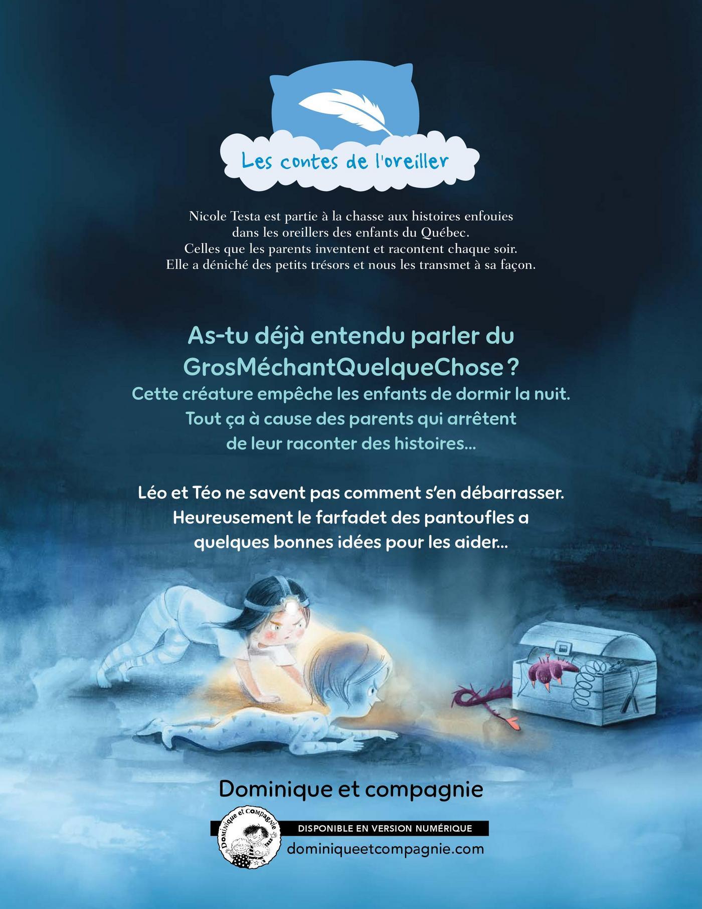 As-tu déjà entendu parler du GrosMéchantQuelqueChose? Cette créature empêche les enfants de dormir la nuit. Tout ça à cause des parents qui arrêtent de leur raconter des histoires... Léo et Théo ne savent pas comment s’en débarrasser. Heureusement le farfadet des pantoufles a quelques bonnes idées pour les aider...Les contes de l’oreillerNicole Testa est partie à la chasse aux histoires enfouies dans les oreillers des enfants du Québec. Celles que les parents inventent et racontent chaque soir. E;;e a déniché des petits trésors et nous les transmets à sa façon.
