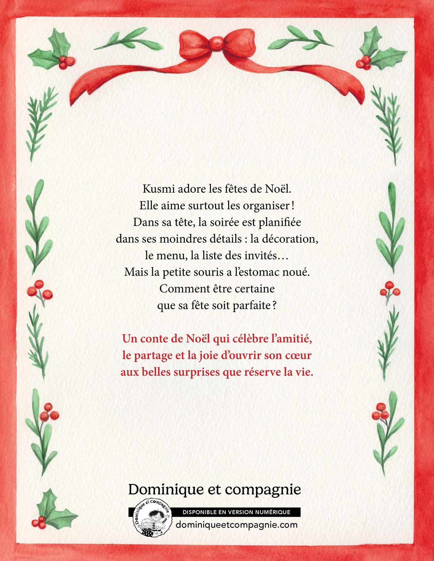 Kusmi adore les fêtes de Noël. Elle aime surtout les organiser! Dans sa tête, la soirée est planifiée dans ses moindres détails : la décoration, le menu, la liste des invités... Mais la petite souris a l’estomac noué. Comment être certaine que sa fête soit parfaite?Un conte de Noël qui célèbre l’amitié, le partage et la joie d’ouvrir son coeur aux belles surprises que réserve la vie.