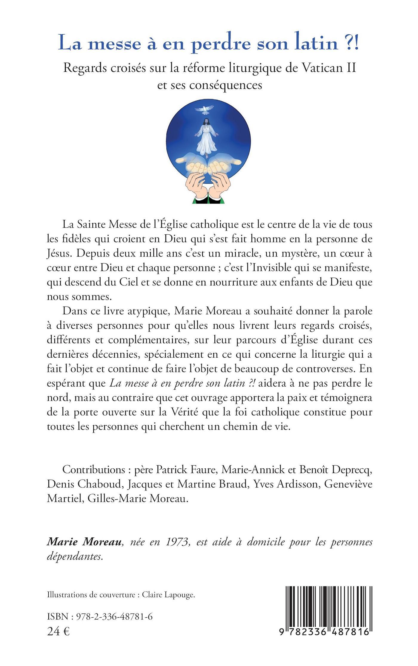 Dans ce livre atypique, Marie Moreau a souhaité donner la parole à diverses personnes pour qu’elles nous livrent leurs regards croisés, différents et complémentaires, sur leur parcours d’Église durant ces dernières décennies, spécialement en ce qui concerne la liturgie qui a fait l’objet et continue de faire l’objet de beaucoup de controverses. En espérant que La messe à en perdre son latin ?! aidera à ne pas perdre le nord, mais au contraire que cet ouvrage apportera la paix et témoignera de la porte ouverte sur la Vérité que la foi catholique constitue pour toutes les personnes qui cherchent un chemin de vie.