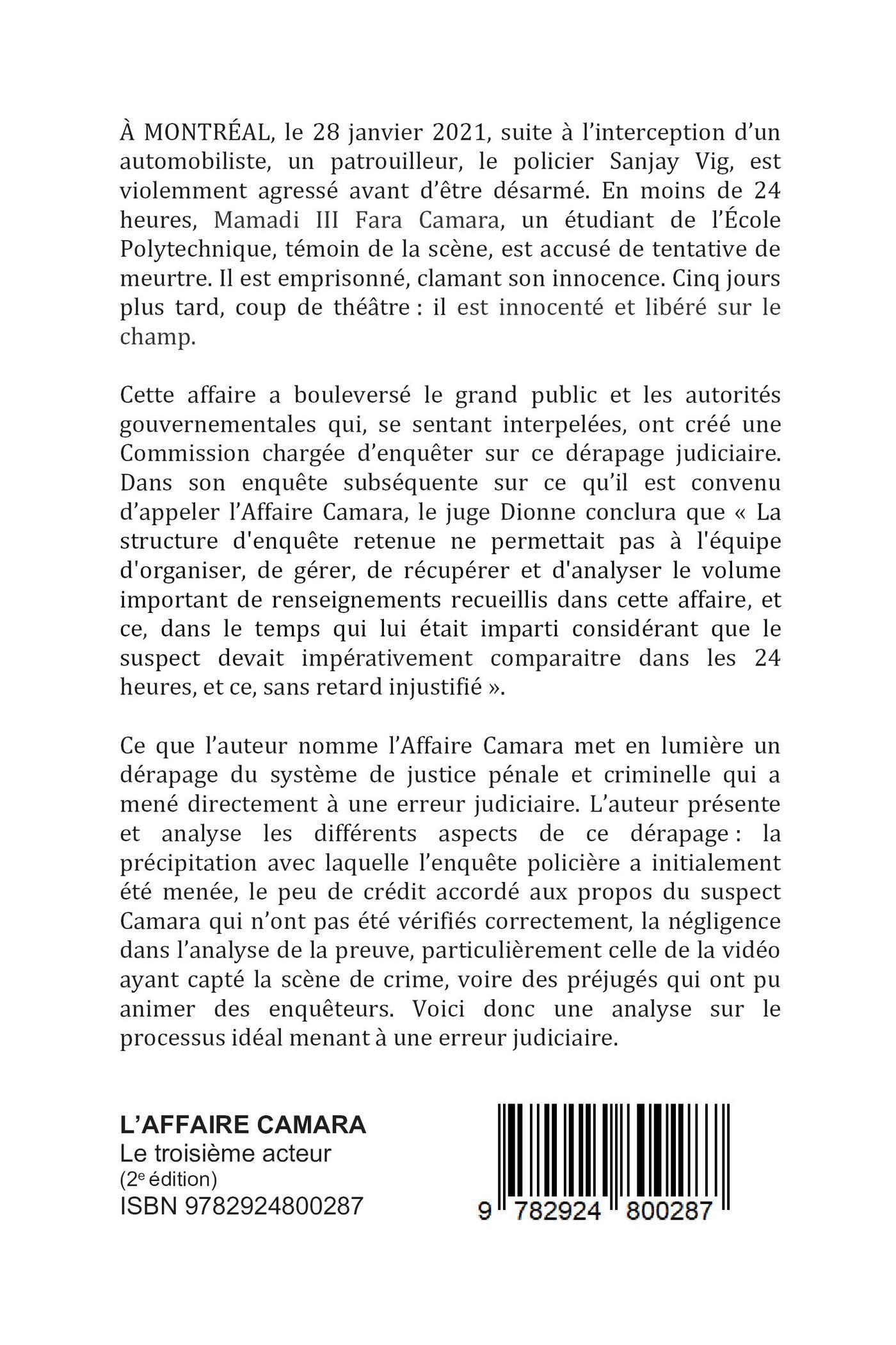 Cette affaire illustre comment un dérapage du système de justice pénale et criminelle mène directement à une erreur judiciaire. Ce dérapage, explique l’auteur, est la conséquence de la précipitation avec laquelle l’enquête policière a initialement été menée, le peu de crédit accordé aux propos du suspect Camara qui n’ont pas été vérifiés correctement, de la négligence dans l’analyse de la preuve, particulièrement celle de la vidéo ayant capté la scène de crime, voire des préjugés qui ont pu animer des enquêteurs. Voici donc le processus idéal menant à une erreur judiciaire et ce livre en fait la démonstration.