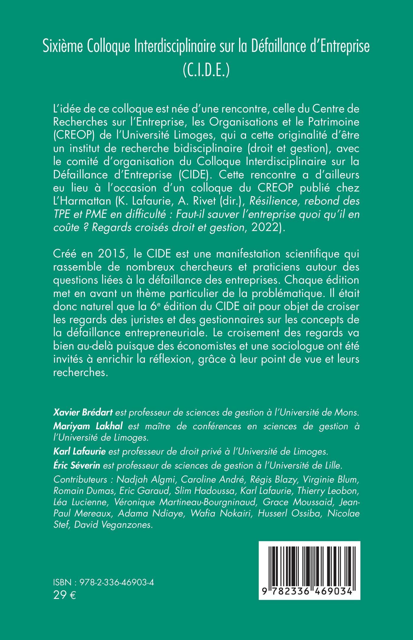 L’idée de ce colloque est née d’une rencontre, celle du Centre de Recherches sur l’Entreprise, les Organisations et le Patrimoine (CREOP) de l’Université Limoges, qui a cette originalité d’être un institut de recherche bidisciplinaire (droit et gestion), avec le comité d’organisation du Colloque Interdisciplinaire sur la Défaillance d’Entreprise (CIDE). Cette rencontre a d’ailleurs eu lieu à l’occasion d’un colloque du CREOP publié chez L’Harmattan (K. Lafaurie, A. Rivet (dir.), Résilence, rebond des TPE et PME en difficulté : Faut-il sauver l’entreprise quoi qu’il en coûte ? Regards croisés droit et gestion, 2022).