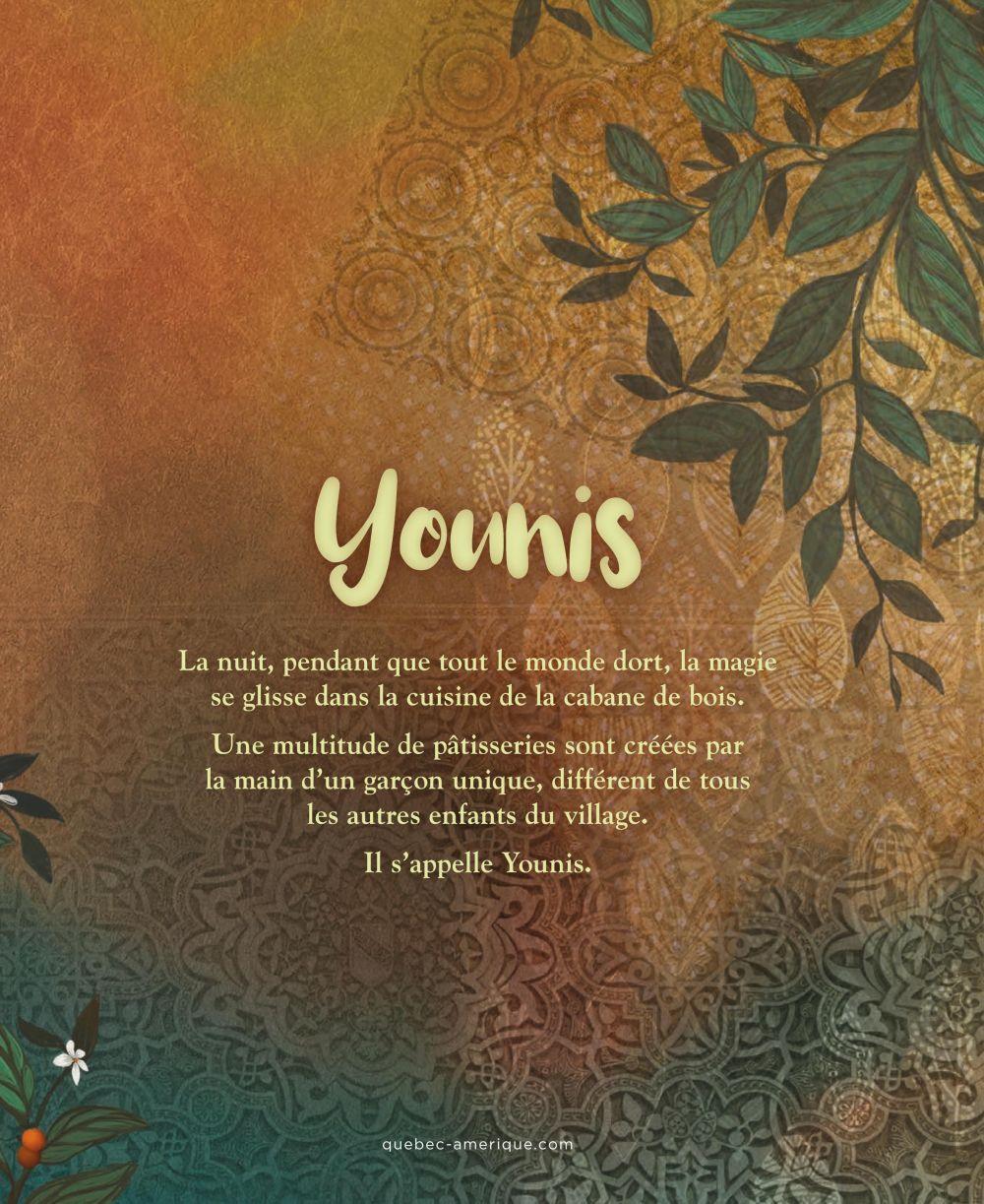Pas dans la version originale (VF + Approuvée)La nuit, pendant que tout le monde dort, la magie se glisse dans la cuisine de la cabane de bois. Une multitude de pâtisseries sont créées par la main d’un enfant unique, différent des autres jeunes du village ; un garçon qui vit avec le syndrome de Down. Il s’appelle Younis.Arguments (statistiques, angles ou éléments particuliers)Thématique peu abordée : Les écoles vont vouloir un album sur la trisomie et la différence !!Images envoûtantes (aspect brumeux et mystérieux) et appétissantes (toutes les pâtisseries ! Miam!)Brève notion d’entreprenariat (le jeune bâti son entreprise)