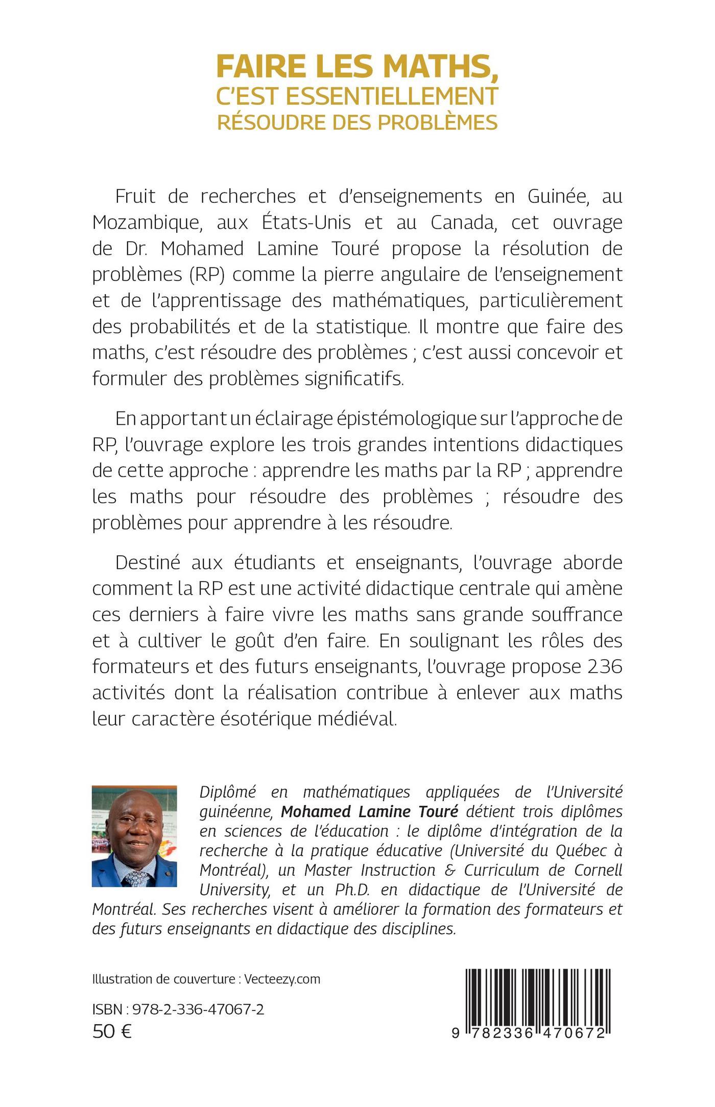 Fruit de recherches et d’enseignements en Guinée, au Mozambique, aux États-Unis et au Canada, cet ouvrage de Dr. Mohamed Lamine Touré propose la résolution de problèmes (RP) comme la pierre angulaire de l’enseignement et de l’apprentissage des mathématiques, particulièrement des probabilités et de la statistique. Il montre que faire des maths, c’est résoudre des problèmes ; c’est aussi concevoir et formuler des problèmes significatifs.