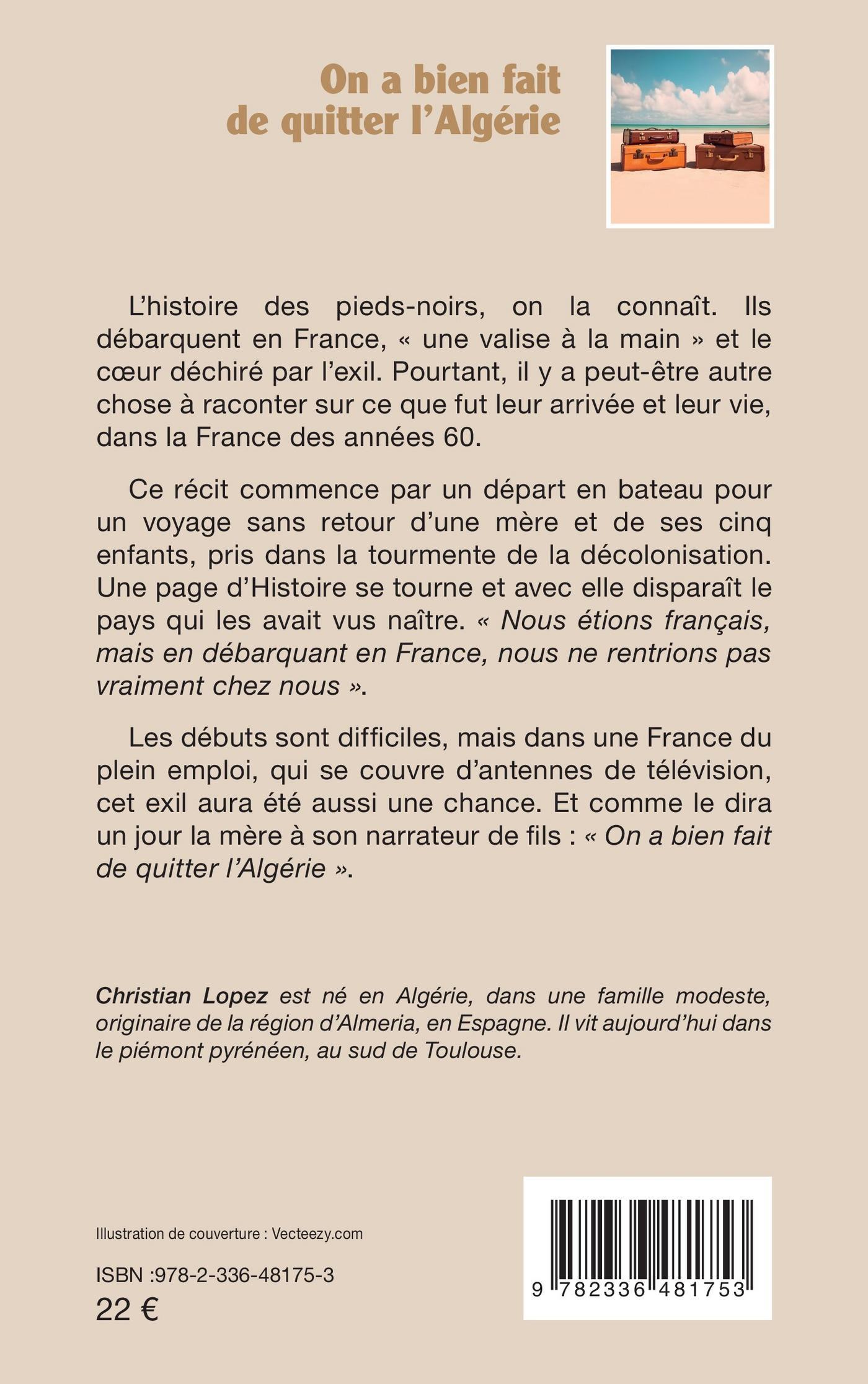 Ce récit commence par un départ en bateau pour un voyage sans retour d’une mère et de ses cinq enfants, pris dans la tourmente de la décolonisation. Une page d’Histoire se tourne et avec elle disparaît le pays qui les avait vus naître. « Nous étions français, mais en débarquant en France, nous ne rentrions pas vraiment chez nous ».