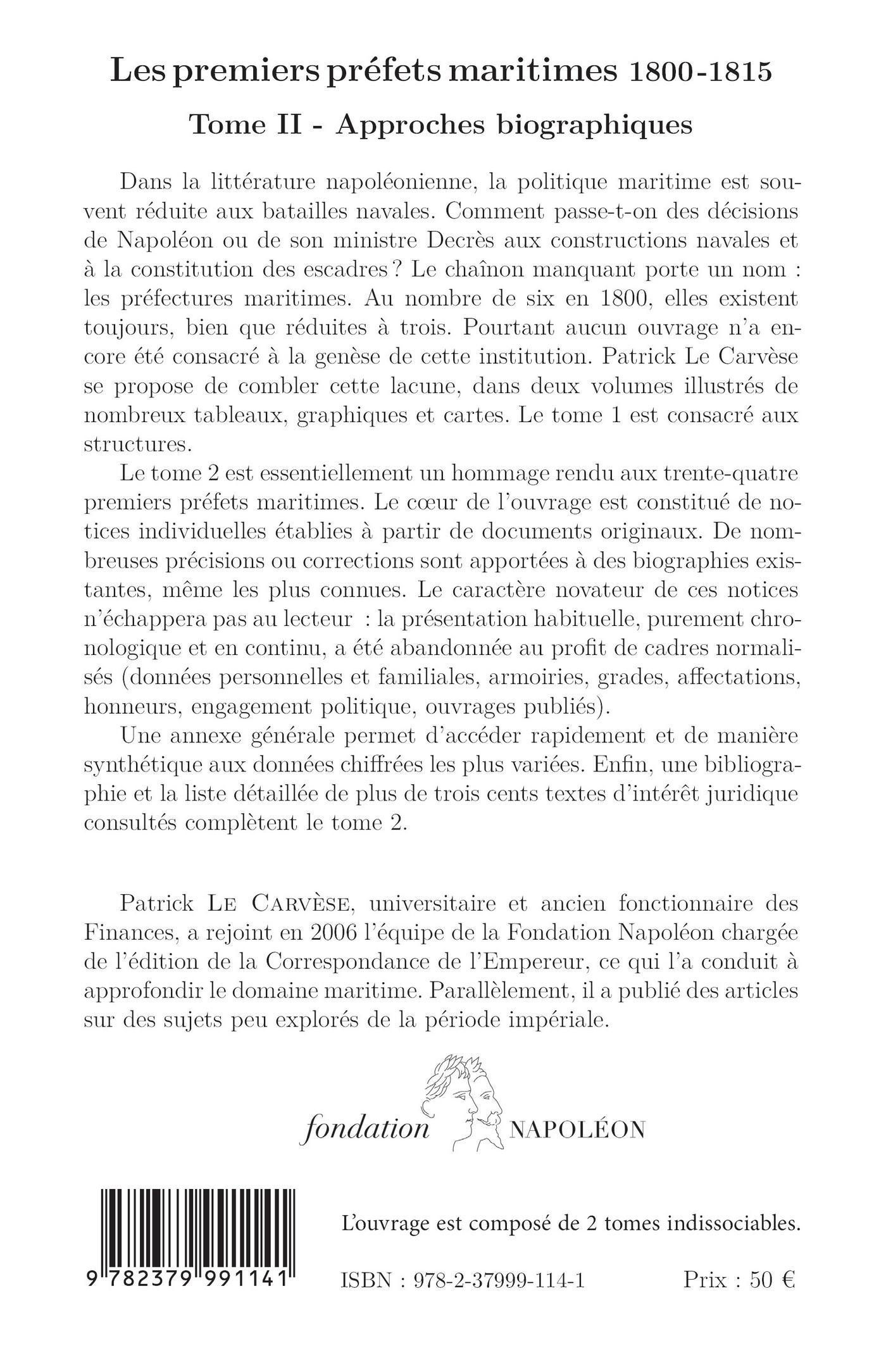 Le tome 2 est essentiellement un hommage rendu aux trente-quatre premiers préfets maritimes. Le coeur de l’ouvrage est constitué de notices individuelles établies à partir de documents originaux. De nombreuses précisions ou corrections sont apportées à des biographies existantes, même les plus connues. Le caractère novateur de ces notices n’échappera pas au lecteur : la présentation habituelle, purement chronologique et en continu, a été abandonnée au profit de cadres normalisés