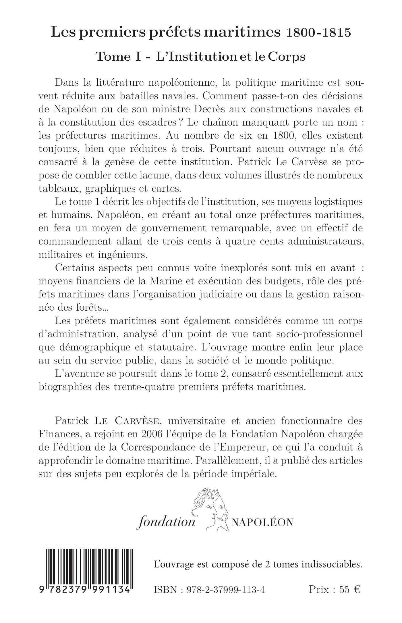 Le tome 1 décrit les objectifs de l’institution, ses moyens logistiques et humains. Napoléon, en créant au total onze préfectures maritimes, en fera un moyen de gouvernement remarquable, avec un effectif de commandement allant de trois cents à quatre cents administrateurs, militaires et ingénieurs.