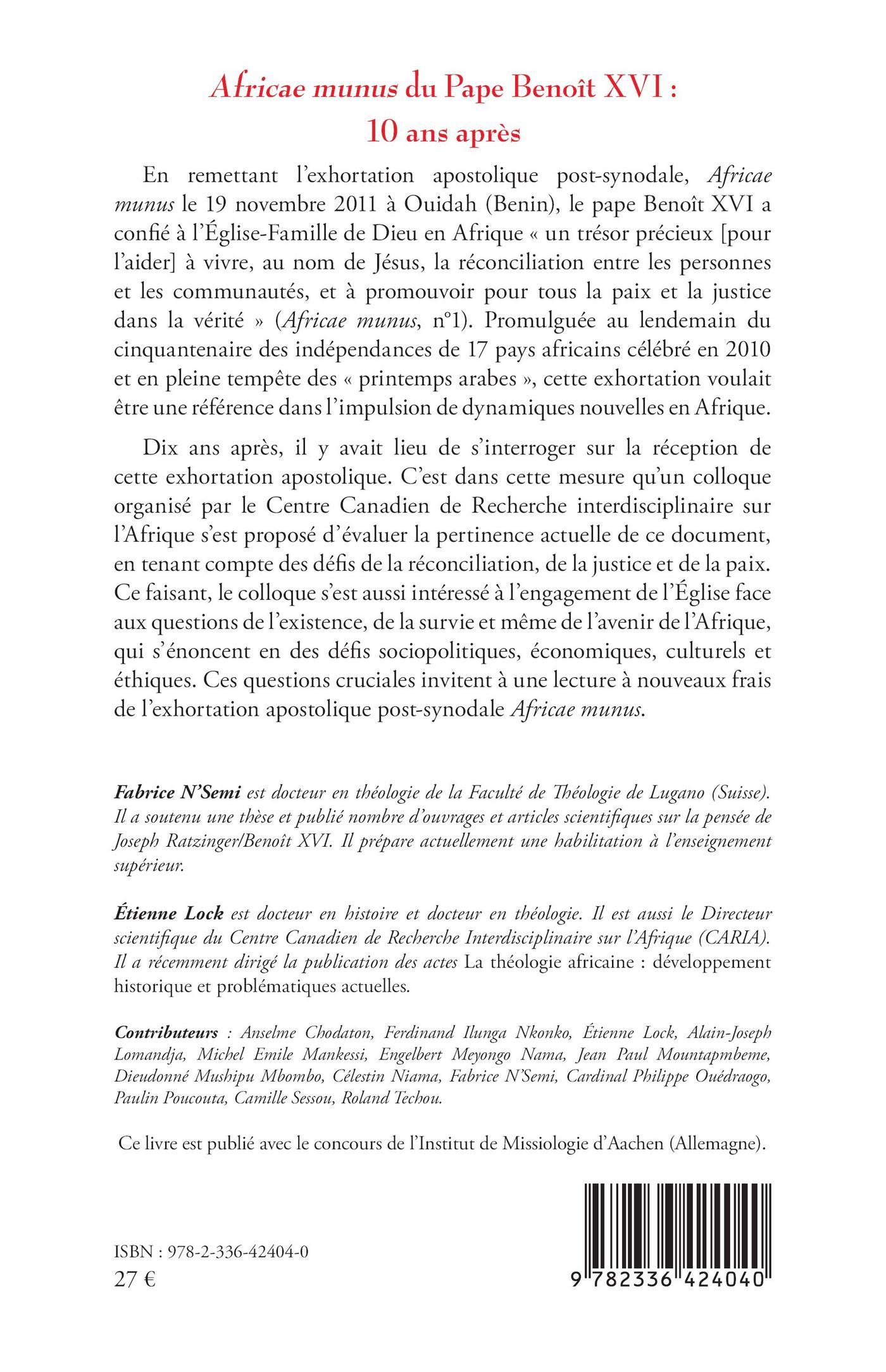 Dix ans après, il y avait lieu de s’interroger sur la réception de cette exhortation apostolique. C’est dans cette mesure qu’un colloque organisé par le Centre Canadien de Recherche interdisciplinaire sur l’Afrique s’est proposé d’évaluer la pertinence actuelle de ce document, en tenant compte des défis de la réconciliation, de la justice et de la paix. Ce faisant, le colloque s’est aussi intéressé à l’engagement de l’Église face aux questions de l’existence, de la survie et même de l’avenir de l’Afrique, qui s’énoncent en des défis sociopolitiques, économiques, culturels et éthiques. Ces questions cruciales invitent à une lecture à nouveaux frais de l’exhortation apostolique post-synodale Africae munus.