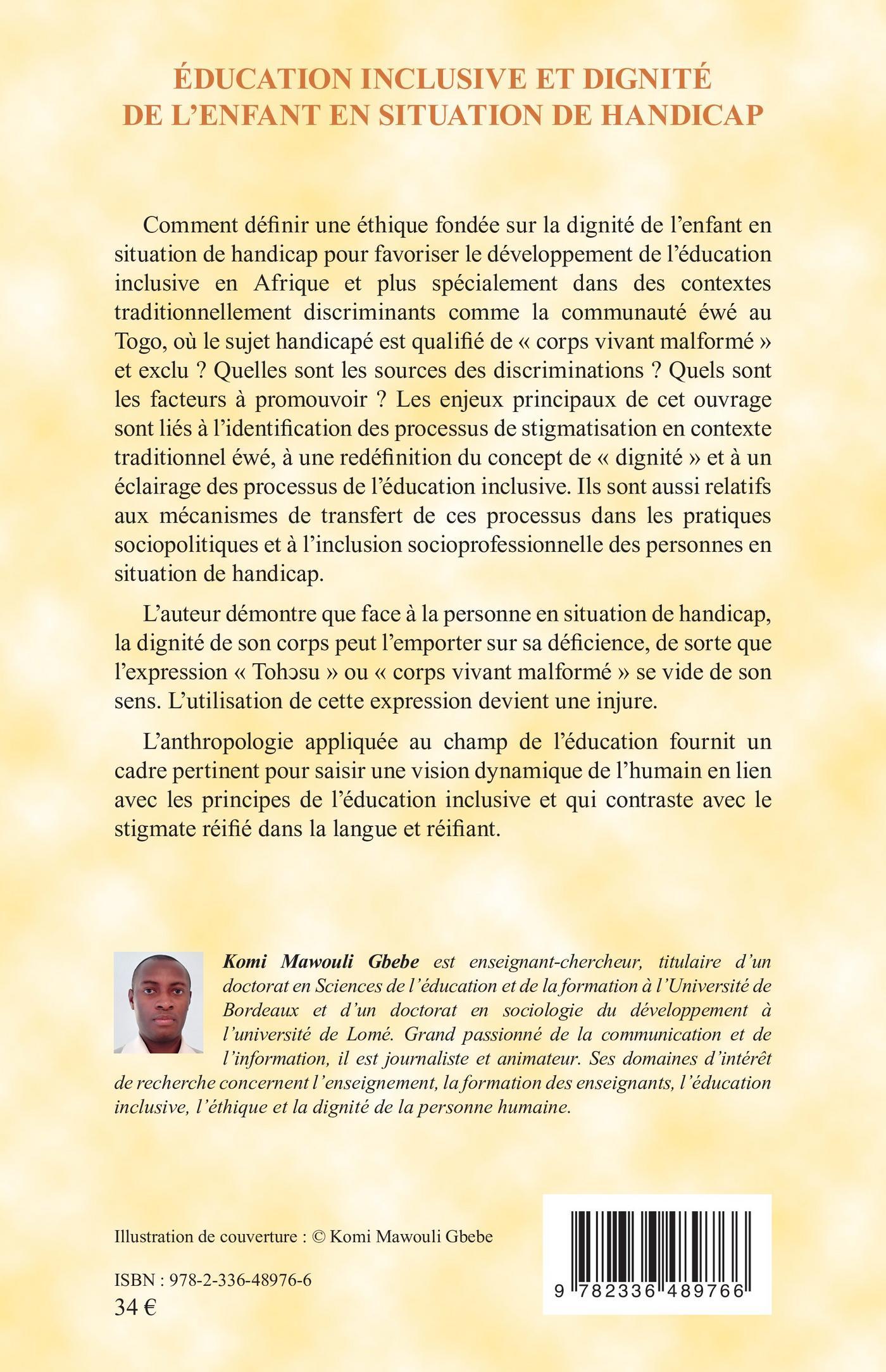 Comment définir une éthique fondée sur la dignité de l’enfant en situation de handicap pour favoriser le développement de l’éducation inclusive en Afrique et plus spécialement dans des contextes traditionnellement discriminants comme la communauté éwé au Togo, où le sujet handicapé est qualifié de « corps vivant malformé » et exclu ? Quelles sont les sources des discriminations ? Quels sont les facteurs à promouvoir ? Les enjeux principaux de cet ouvrage sont liés à l’identification des processus de stigmatisation en contexte traditionnel éwé, à une redéfinition du concept de « dignité » et à un éclairage des processus de l’éducation inclusive. Ils sont aussi relatifs aux mécanismes de transfert de ces processus dans les pratiques sociopolitiques et à l’inclusion socioprofessionnelle des personnes en situation de handicap.
