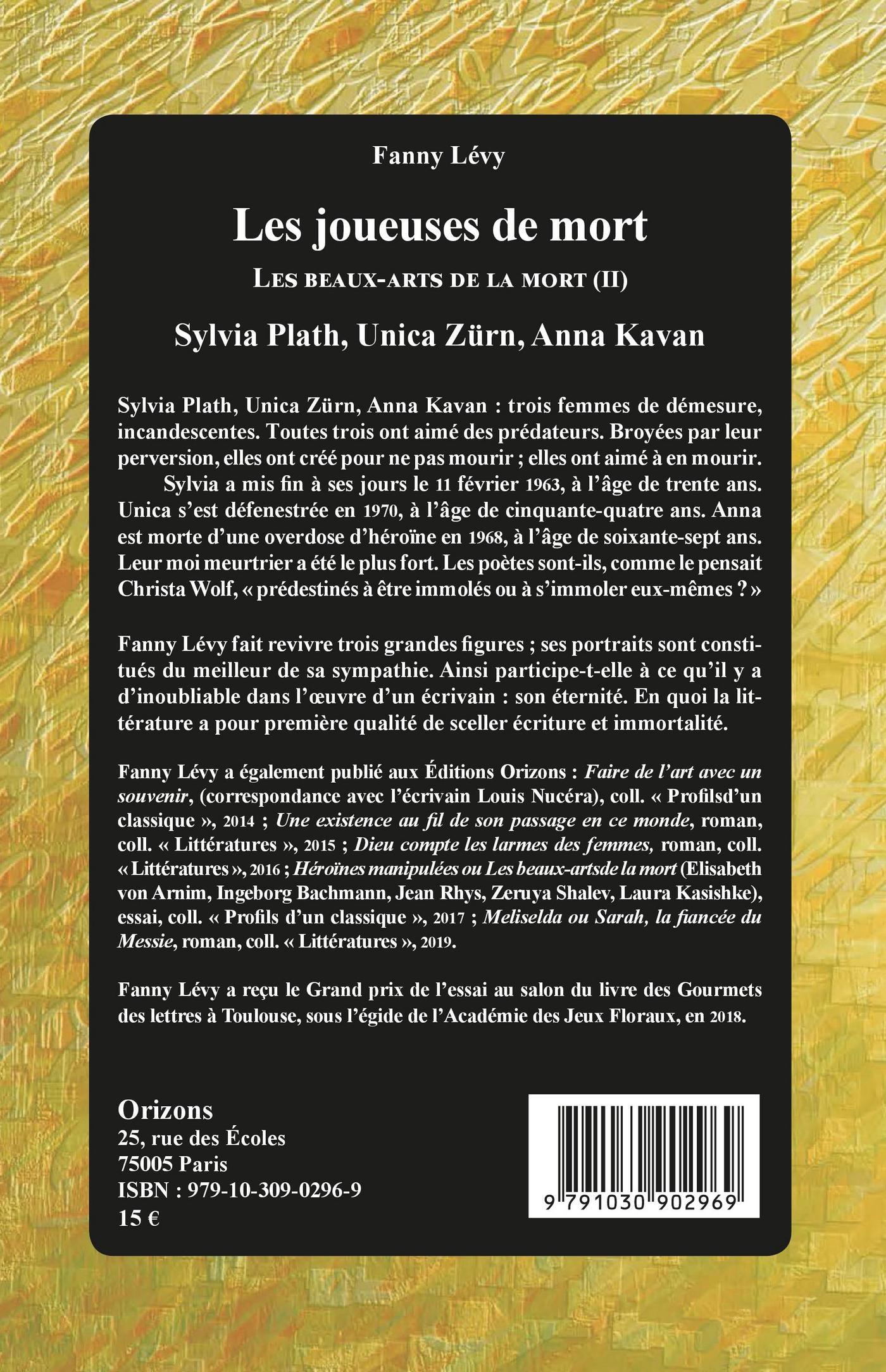 Sylvia Plath, Unica Zürn, Anna Kavan : trois femmes de démesure. Elles ont aimé des prédateurs. Broyées par leur perversion, elles ont créé pour ne pas mourir ; elles ont aimé à en mourir. Sylvia a mis fin à ses jours, à l'âge de trente ans. Unica s'est défenestrée ; elle avait cinquante-quatre ans ; Anna est morte d'une overdose d'héroïne à soixante-sept ans.