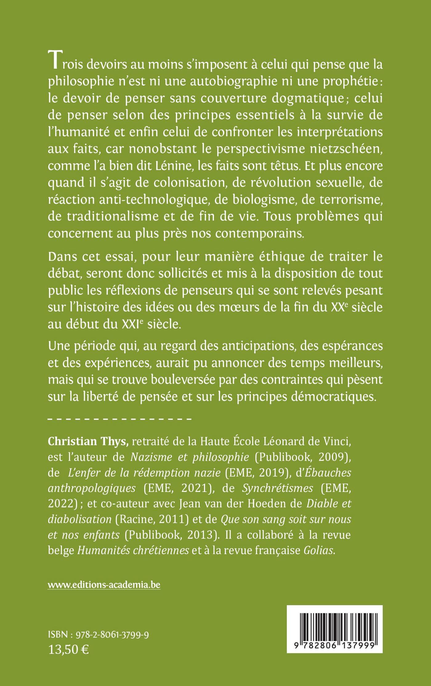 Trois devoirs au moins s’imposent à celui qui pense que la philosophie n’est ni une autobiographie ni une prophétie : le devoir de penser sans couverture dogmatique ; celui de penser selon des principes essentiels à la survie de l’humanité et enfin celui de confronter les interprétations aux faits, car nonobstant le perspectivisme nietzschéen, comme l’a bien dit Lénine, les faits sont têtus. Et plus encore quand il s’agit de colonisation, de révolution sexuelle, de réaction anti-technologique, de biologisme, de terrorisme, de traditionalisme et de fin de vie. Tous problèmes qui concernent au plus près nos contemporains.