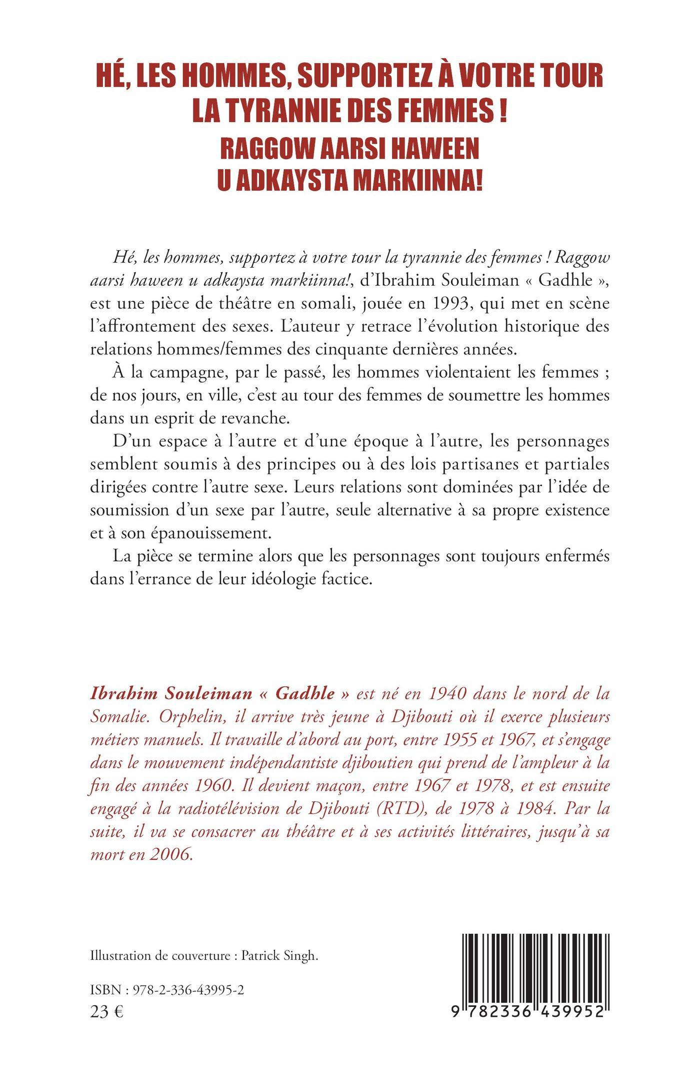 Hé, les hommes, supportez à votre tour la tyrannie des femmes ! Raggow aarsi haween u adkaysta markiinna!, d’Ibrahim Souleiman « Gadhle », est une pièce de théâtre en somali, jouée en 1993, qui met en scène l’affrontement des sexes. L’auteur y retrace l’évolution historique des relations hommes/femmes des cinquante dernières années.