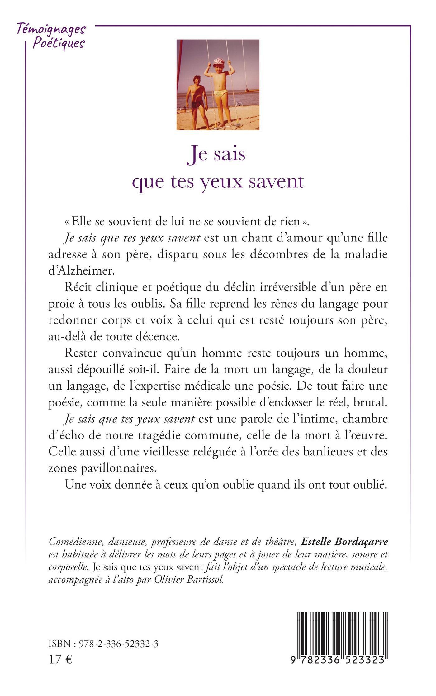 Je sais que tes yeux savent est un chant d’amour qu’une fille adresse à son père, disparu sous les décombres de la maladie d’Alzheimer.
