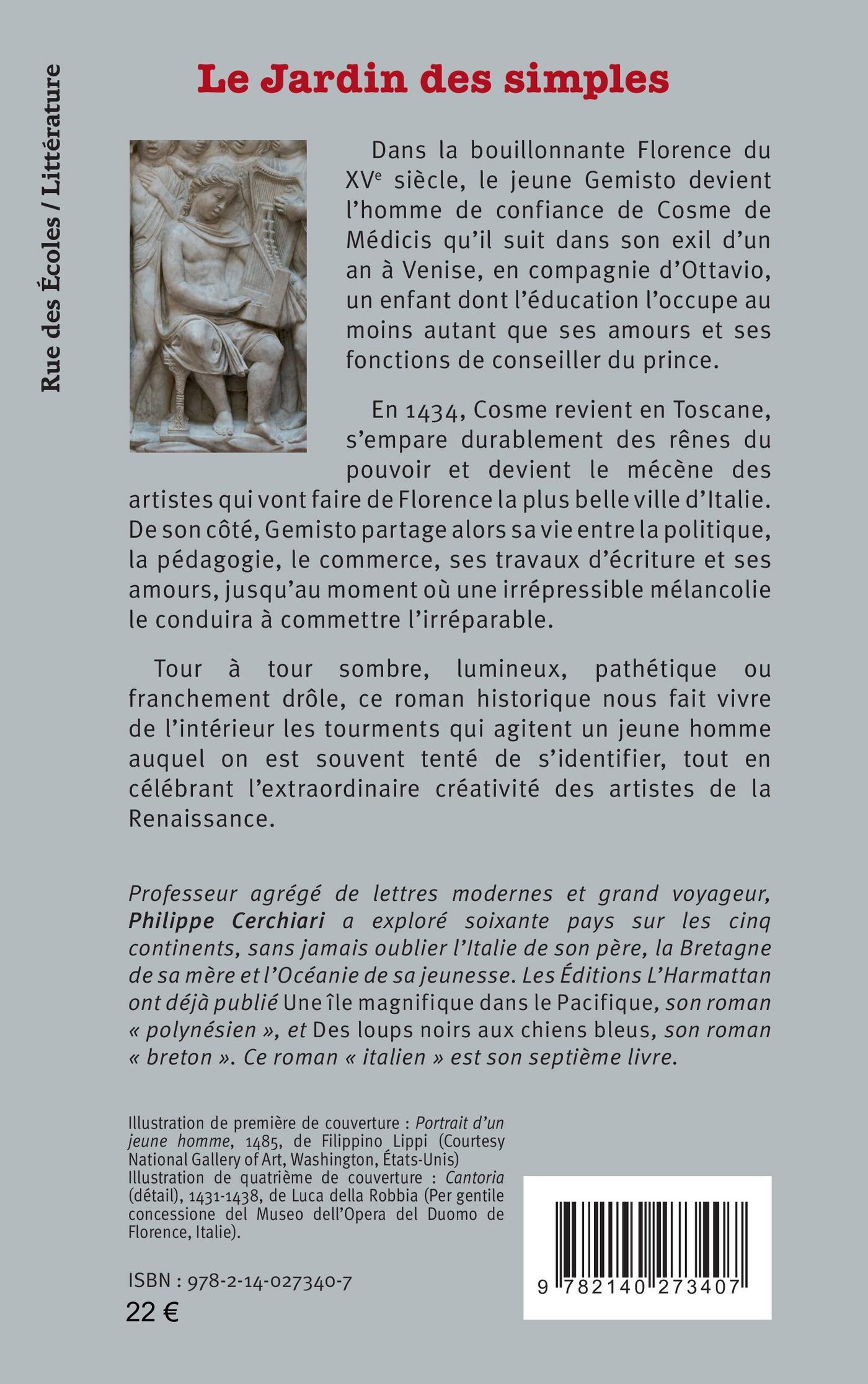 Dans la bouillonnante Florence du XVe siècle, le jeune Gemisto devient l’homme de confiance de Cosme de Médicis qu’il suit dans son exil d’un an à Venise, en compagnie d’Ottavio, un enfant dont l’éducation l’occupe au moins autant que ses amours et ses fonctions de conseiller du prince.En 1434, Cosme revient en Toscane, s’empare durablement des rênes du pouvoir et devient le mécène des artistes qui vont faire de Florence la plus belle ville d’Italie. De son côté, Gemisto partage alors sa vie entre la politique, la pédagogie, le commerce, ses travaux d’écriture et ses amours, jusqu’au moment où une irrépressible mélancolie le conduira à commettre l’irréparable.Tour à tour sombre, lumineux, pathétique ou franchement drôle, ce roman historique nous fait vivre de l’intérieur les tourments qui agitent un jeune homme auquel on est souvent tenté de s’identifier, tout en célébrant l’extraordinaire créativité des artistes de la Renaissance.