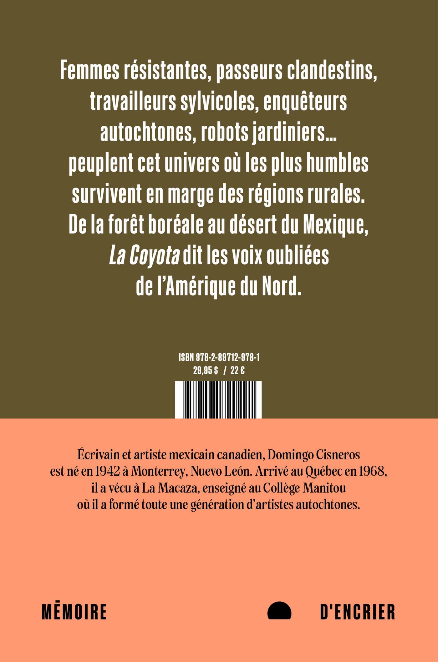 Femmes résistantes, passeurs clandestins, travailleurs sylvicoles, enquêteurs autochtones, robots jardiniers... peuplent cet univers où les plus humbles survivent en marge des régions rurales. De la forêt boréale au désert du Mexique, La Coyota dit les voix oubliées de l'Amérique du Nord. Écrivain et artiste mexicain canadien, Domingo Cisneros est né en 1942 à Monterrey, Nuevo León. Arrivé au Québec en 1968, il a vécu à La Macaza, enseigné au Collège Manitou où il a formé toute une génération d'artistes autochtones.