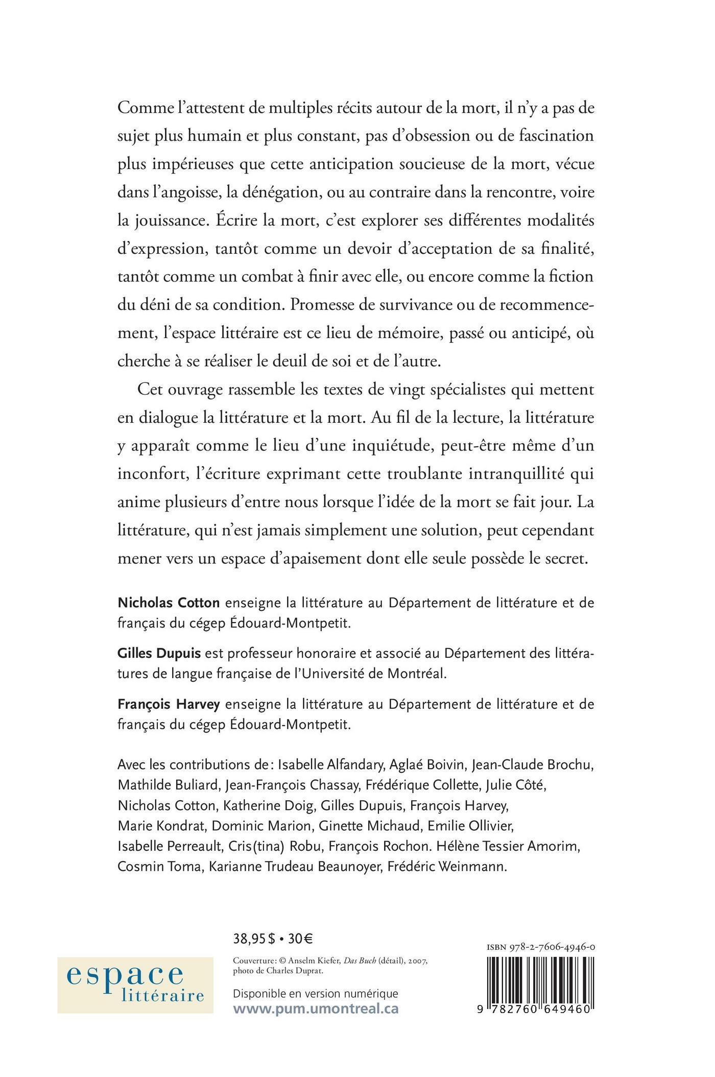 Comme l’attestent de multiples récits autour de la mort, il n’y a pas de sujet plus humain et plus constant, pas d’obsession ou de fascination plus impérieuses que cette anticipation soucieuse de la mort, vécue dans l’angoisse, la dénégation, ou au contraire dans la rencontre, voire la jouissance. Écrire la mort, c’est explorer ses différentes modalités d’expression, tantôt comme un devoir d’acceptation de sa finalité, tantôt comme un combat à finir avec elle, ou encore comme la fiction du déni de sa condition. Promesse de survivance ou de recommencement, l’espace littéraire est ce lieu de mémoire, passé ou anticipé, où cherche à se réaliser le deuil de soi et de l’autre.Cet ouvrage rassemble les textes de vingt spécialistes qui mettent en dialogue la littérature et la mort. Au fil de la lecture, la littérature y apparaît comme le lieu d’une inquiétude, peut-être même d’un inconfort, l’écriture exprimant cette troublante intranquillité qui anime plusieurs d’entre nous lorsque l’idée de la mort se fait jour. La littérature, qui n’est jamais simplement une solution, peut cependant mener vers un espace d’apaisement dont elle seule possède le secret.